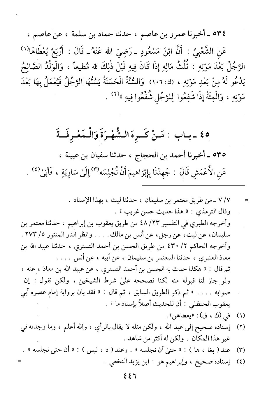 534 - أَخْبَرَنَا عَمْرُو بْنُ عَاصِمٍ، حَدَّثَنَا حَمَّادُ بْنُ سَلَمَةَ، عَنْ عَاصِمٍ، عَنِ الشَّعْبِيِّ، أَنَّ ابْنَ مَسْعُودٍ رَضِيَ اللَّهُ عَنْهُ، قَالَ: «§أَرْبَعٌ يُعْطَاهَا الرَّجُلُ بَعْدَ مَوْتِهِ، ثُلُثُ مَالِهِ إِذَا كَانَ فِيهِ قَبْلَ ذَلِكَ لِلَّهِ مُطِيعًا، وَالْوَلَدُ الصَّالِحُ يَدْعُو لَهُ مِنْ بَعْدِ مَوْتِهِ، وَالسُّنَّةُ الْحَسَنَةُ يَسُنُّهَا الرَّجُلُ، فَيُعْمَلُ بِهَا بَعْدَ مَوْتِهِ، وَالْمِائَةُ إِذَا شَفَعُوا لِلرَّجُلِ شُفِّعُوا فِيهِ» Qإسناده صحيح إلى عبد الله ولكن مثله لا يقال بالرأي