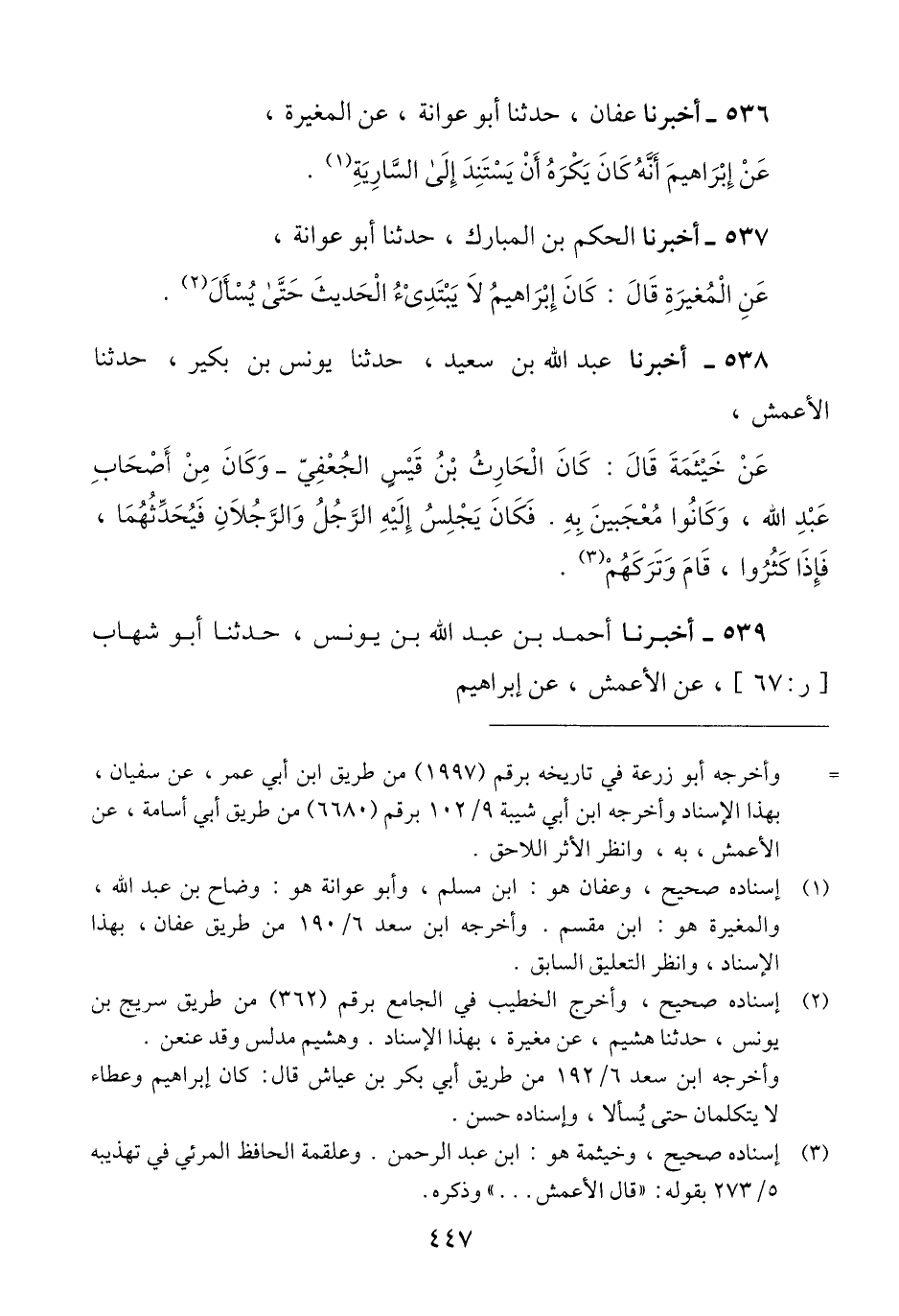 537 - أَخْبَرَنَا الْحَكَمُ بْنُ الْمُبَارَكِ، حَدَّثَنَا أَبُو عَوَانَةَ، عَنْ مُغِيرَةَ، قَالَ: كَانَ إِبْرَاهِيمُ، «§لَا يَبْتَدِئُ الْحَدِيثَ حَتَّى يُسْأَلَ» Qإسناده صحيح