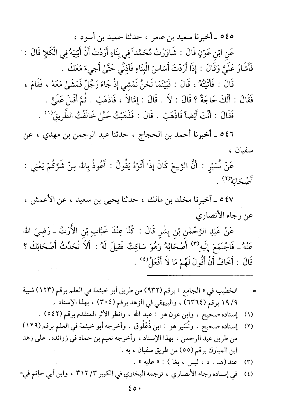 547 - أَخْبَرَنَا مَخْلَدُ بْنُ مَالِكٍ، حَدَّثَنَا يَحْيَى بْنُ سَعِيدٍ، عَنِ الْأَعْمَشِ، عَنْ رَجَاءٍ الْأَنْصَارِيِّ، عَنْ عَبْدِ الرَّحْمَنِ بْنِ بِشْرٍ، قَالَ: كُنَّا عِنْدَ خَبَّابِ بْنِ الْأَرَتِّ رَضِيَ اللَّهُ عَنْهُ، فَاجْتَمَعَ إِلَيْهِ أَصْحَابُهُ وَهُوَ سَاكِتٌ فَقِيلَ لَهُ: أَلَا تُحَدِّثُ أَصْحَابَكَ؟ قَالَ: «§أَخَافُ أَنْ أَقُولَ لَهُمْ مَا لَا أَفْعَلُ» Qفي إسناده رجاء الأنصاري وهذا إسناد ضعيف