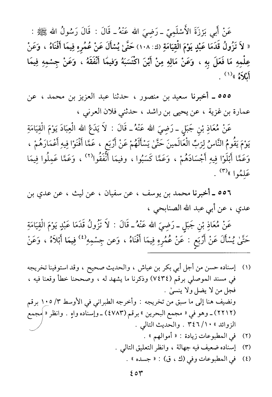 555 - أَخْبَرَنَا سَعِيدُ بْنُ مَنْصُورٍ، حَدَّثَنَا عَبْدُ الْعَزِيزِ بْنُ مُحَمَّدٍ، عَنْ عُمَارَةَ بْنِ غَزِيَّةَ، عَنْ يَحْيَى بْنِ رَاشِدٍ، حَدَّثَنِي فُلَانٌ الْعُرَنِيُّ، عَنْ مُعَاذِ بْنِ جَبَلٍ رَضِيَ اللَّهُ عَنْهُ، قَالَ: «§لَا يَدَعُ اللَّهُ الْعِبَادَ يَوْمَ الْقِيَامَةِ، يَوْمَ يَقُومُ النَّاسُ لِرَبِّ الْعَالَمِينَ، حَتَّى يَسْأَلَهُمْ عَنْ أَرْبَعٍ، عَمَّا أَفْنَوْا فِيهِ أَعْمَارَهُمْ، وَعَمَّا أَبْلَوْا فِيهِ أَجْسَادَهُمْ، وَعَمَّا كَسَبُوا، وفِيما أَنْفَقُوا، وَعَمَّا عَمِلُوا، فِيمَا عَلِمُوا» Qإسناده ضعيف فيه جهالة