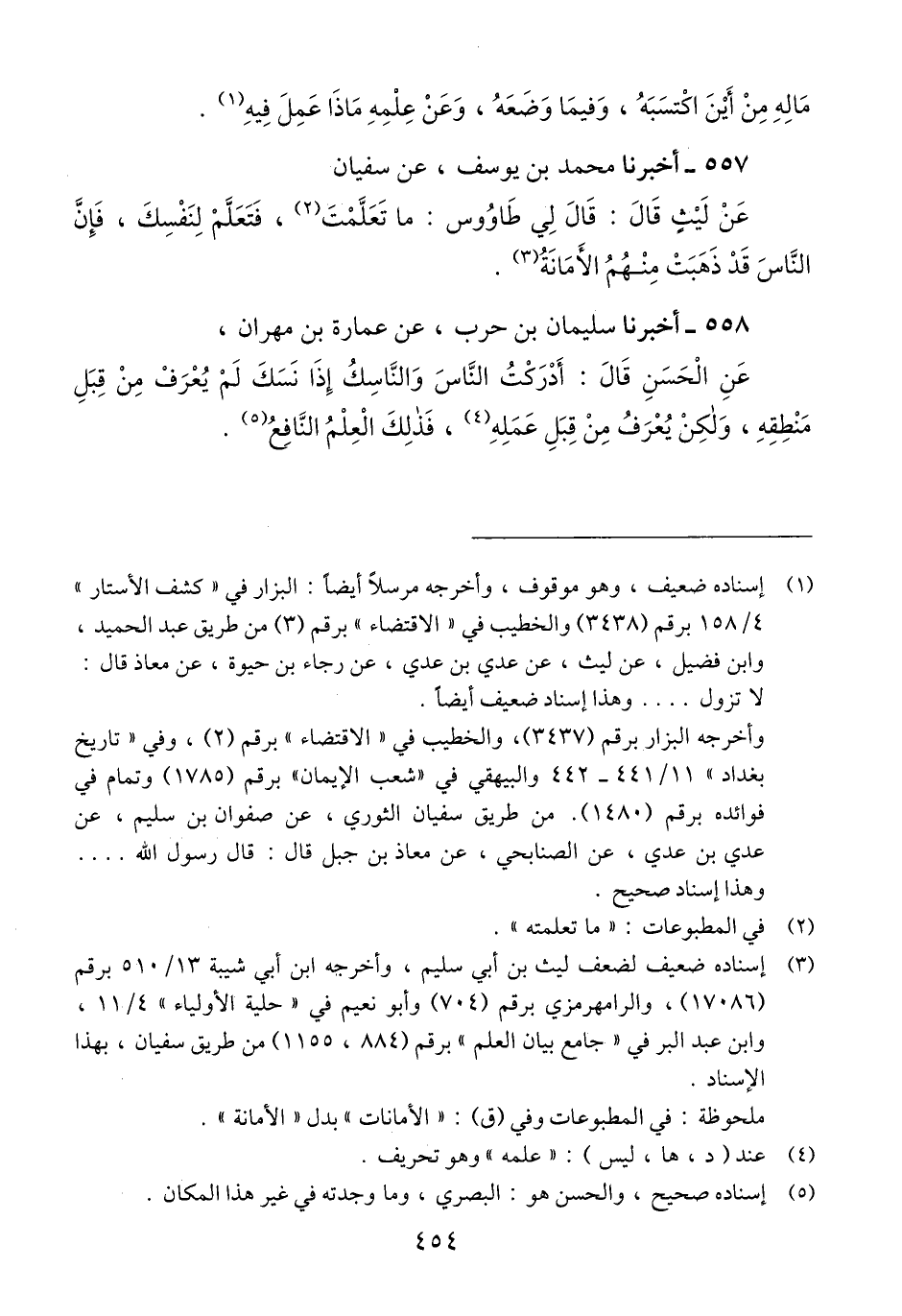 557 - أَخْبَرَنَا مُحَمَّدُ بْنُ يُوسُفَ، عَنْ سُفْيَانَ، عَنْ لَيْثٍ، قَالَ: قَالَ لِي طَاوُسٌ، «§مَا تَعَلَّمْتَ، فَتَعَلَّمْ لِنَفْسِكَ، فَإِنَّ النَّاسَ قَدْ ذَهَبَتْ مِنْهُمُ الْأَمَانَةُ» Qإسناده ضعيف لضعف ليث بن أبي سليم