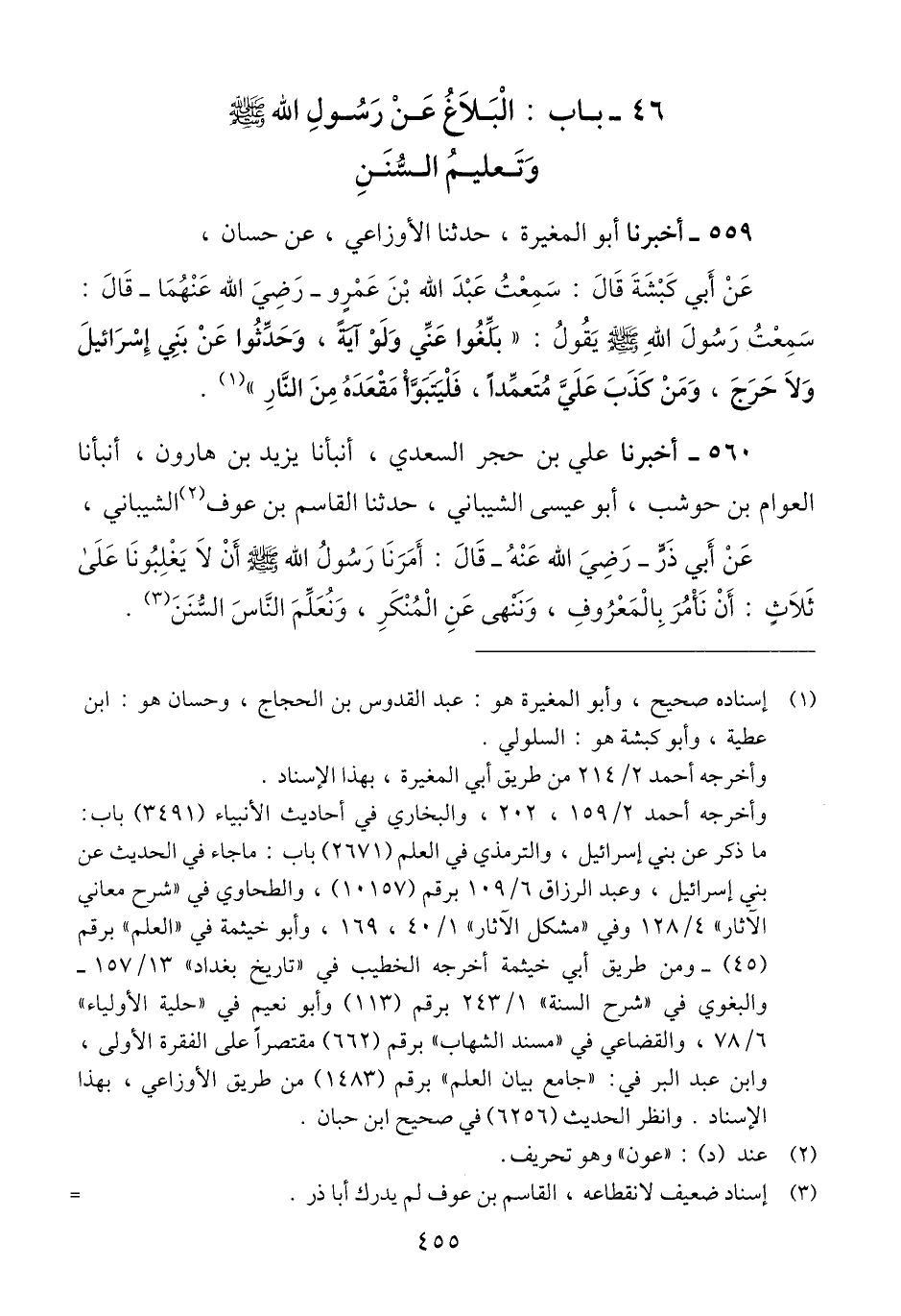 559 - أَخْبَرَنَا أَبُو الْمُغِيرَةِ، حَدَّثَنَا الْأَوْزَاعِيُّ، عَنْ حَسَّانَ، عَنْ أَبِي كَبْشَةَ قَالَ: سَمِعْتُ عَبْدَ اللَّهِ بْنَ عَمْرٍو رَضِيَ اللَّهُ عَنْهُمَا قَالَ: سَمِعْتُ رَسُولَ اللَّهِ صَلَّى اللهُ عَلَيْهِ وَسَلَّمَ يَقُولُ: «§بَلِّغُوا عَنِّي وَلَوْ آيَةً، وَحَدِّثُوا عَنْ بَنِي إِسْرَائِيلَ وَلَا حَرَجَ، وَمَنْ كَذَبَ عَلَيَّ مُتَعَمِّدًا، فَلْيَتَبَوَّأْ مَقْعَدَهُ مِنَ النَّارِ» Qإسناده صحيح