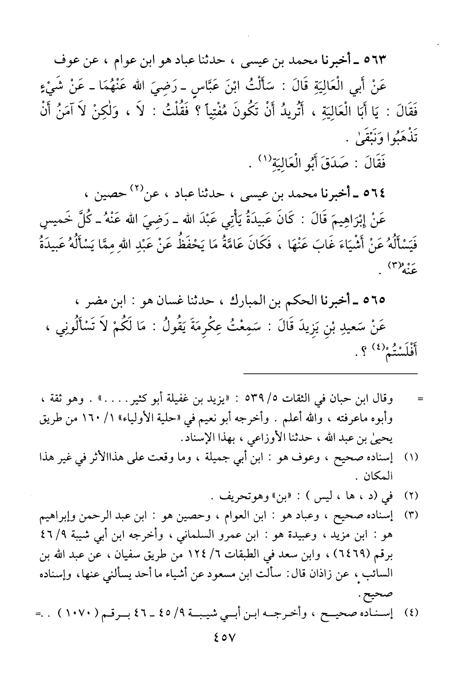 563 - أَخْبَرَنَا مُحَمَّدُ بْنُ عِيسَى، حَدَّثَنَا عَبَّادٌ هُوَ ابْنُ الْعَوَّامِ، عَنْ عَوْفٍ، عَنْ أَبِي الْعَالِيَةِ، قَالَ: سَأَلْتُ ابْنَ عَبَّاسٍ رَضِيَ اللَّهُ عَنْهُمَا، عَنْ شَيْءٍ فَقَالَ: «يَا أَبَا الْعَالِيَةِ، §أَتُرِيدُ أَنْ تَكُونَ مُفْتِيًا؟» فَقُلْتُ: لَا، وَلَكِنْ لَا آمَنُ أَنْ تَذْهَبُوا وَنَبْقَى، فَقَالَ: «صَدَقَ أَبُو الْعَالِيَةِ» Qإسناده صحيح