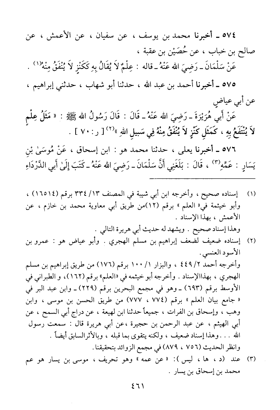 575 - أَخْبَرَنَا أَحْمَدُ بْنُ عَبْدِ اللَّهِ، حَدَّثَنَا أَبُو شِهَابٍ، حَدَّثَنِي إِبْرَاهِيمُ، عَنْ أَبِي عِيَاضٍ، عَنْ أَبِي هُرَيْرَةَ رَضِيَ اللَّهُ عَنْهُ، قَالَ: قَالَ رَسُولُ اللَّهِ صَلَّى اللهُ عَلَيْهِ وَسَلَّمَ: «§مَثَلُ عِلْمٍ لَا يُنْتَفَعُ بِهِ، كَمَثَلِ كَنْزٍ لَا يُنْفَقُ مِنْهُ فِي سَبِيلِ اللَّهِ» Qإسناده ضعيف لضعف إبراهيم بن مسلم الهجري