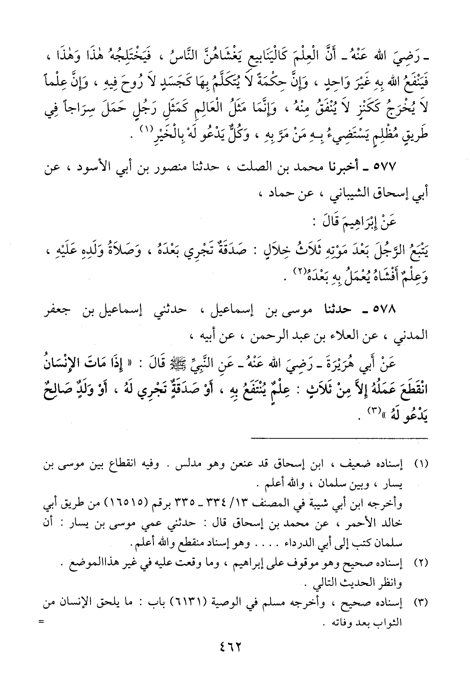 578 - حَدَّثَنَا مُوسَى بْنُ إِسْمَاعِيلَ، حَدَّثَنِي إِسْمَاعِيلُ بْنُ جَعْفَرٍ الْمَدَنِيُّ، عَنِ الْعَلَاءِ بْنِ عَبْدِ الرَّحْمَنِ، عَنْ أَبِيهِ، عَنْ أَبِي هُرَيْرَةَ رَضِيَ اللَّهُ عَنْهُ، عَنِ النَّبِيِّ صَلَّى اللهُ عَلَيْهِ وَسَلَّمَ قَالَ: " §إِذَا مَاتَ الْإِنْسَانُ، انْقَطَعَ عَمَلُهُ إِلَّا مِنْ ثَلَاثٍ: عِلْمٍ يُنْتَفَعُ بِهِ، أَوْ صَدَقَةٍ تَجْرِي لَهُ، أَوْ وَلَدٍ صَالِحٍ يَدْعُو لَهُ "Qإسناده صحيح
