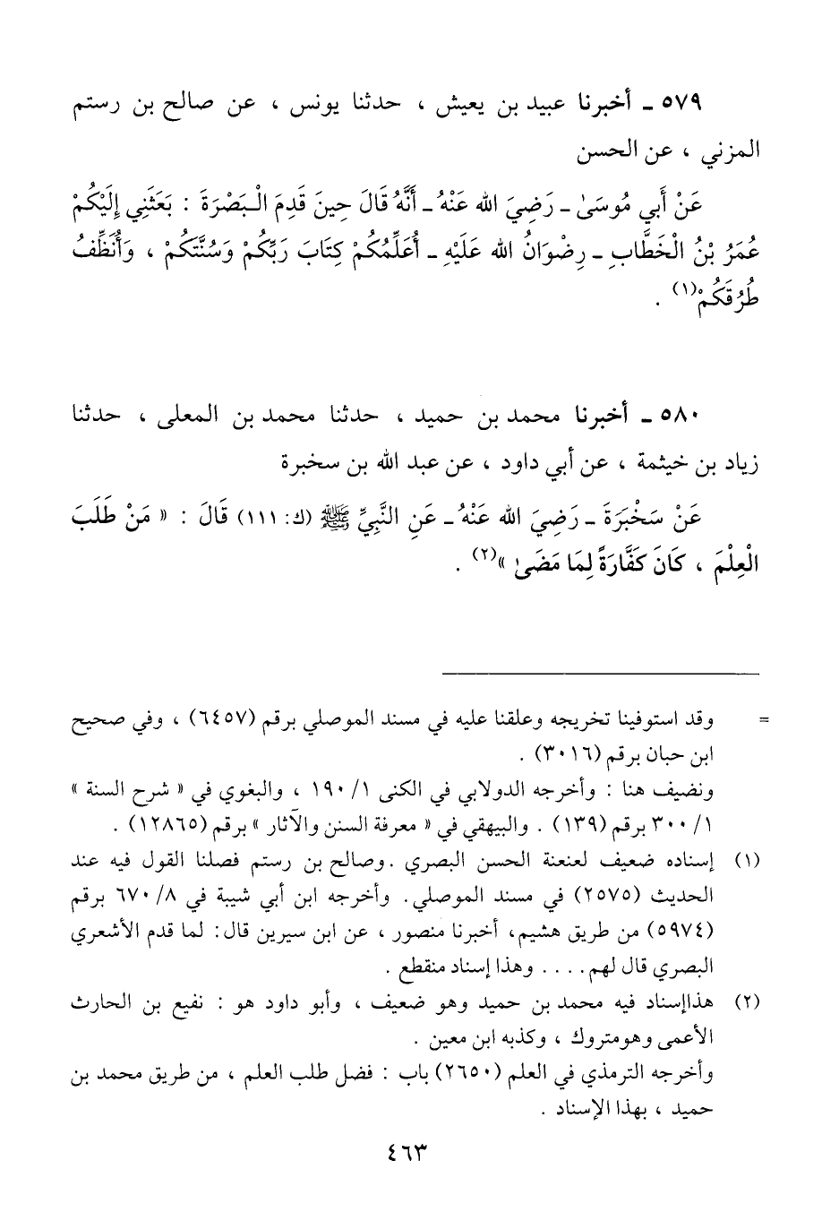 580 - أَخْبَرَنَا مُحَمَّدُ بْنُ حُمَيْدٍ، حَدَّثَنَا مُحَمَّدُ بْنُ الْمُعَلَّى، حَدَّثَنَا زِيَادُ بْنُ خَيْثَمَةَ، عَنْ أَبِي دَاوُدَ، عَنْ عَبْدِ اللَّهِ بْنِ سَخْبَرَةَ، عَنْ سَخْبَرَةَ رَضِيَ اللَّهُ عَنْهُ، عَنِ النَّبِيِّ صَلَّى اللهُ عَلَيْهِ وَسَلَّمَ قَالَ: «§مَنْ طَلَبَ الْعِلْمَ، كَانَ كَفَّارَةً لِمَا مَضَى» Qهذا إسناد فيه محمد بن حميد وهو ضعيف