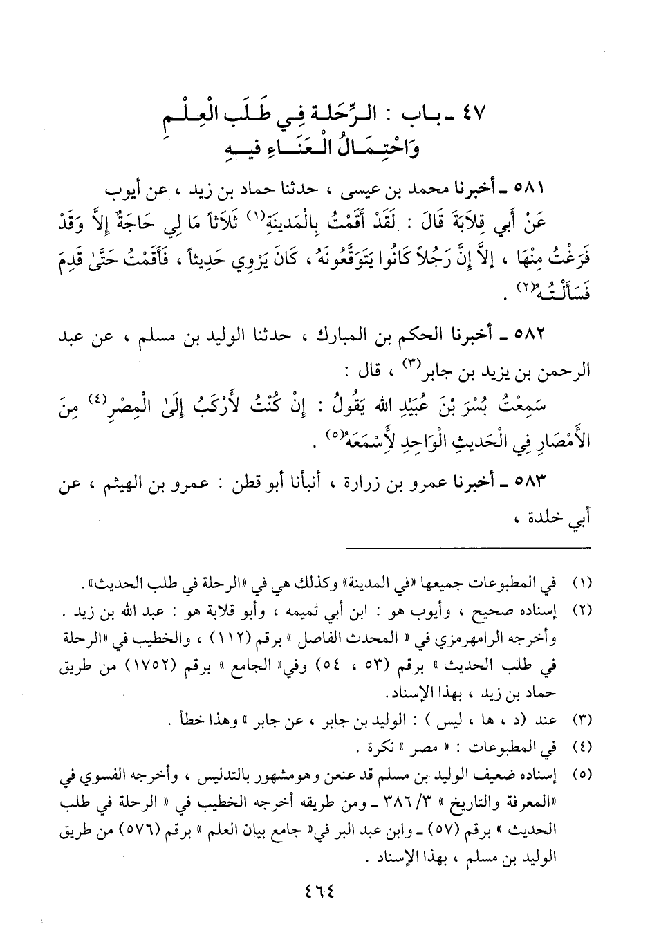 581 - أَخْبَرَنَا مُحَمَّدُ بْنُ عِيسَى، حَدَّثَنَا حَمَّادُ بْنُ زَيْدٍ، عَنْ أَيُّوبَ، عَنْ أَبِي قِلَابَةَ، قَالَ: «لَقَدْ §أَقَمْتُ بالمدينةِ ثَلَاثًا مَا لِي حَاجَةٌ، إِلَّا وَقَدْ فَرَغْتُ مِنْهَا، إِلَّا أَنَّ رَجُلًا كَانُوا يَتَوَقَّعُونَهُ، كَانَ يَرْوِي حَدِيثًا، فَأَقَمْتُ حَتَّى قَدِمَ فَسَأَلْتُهُ» Qإسناده صحيح