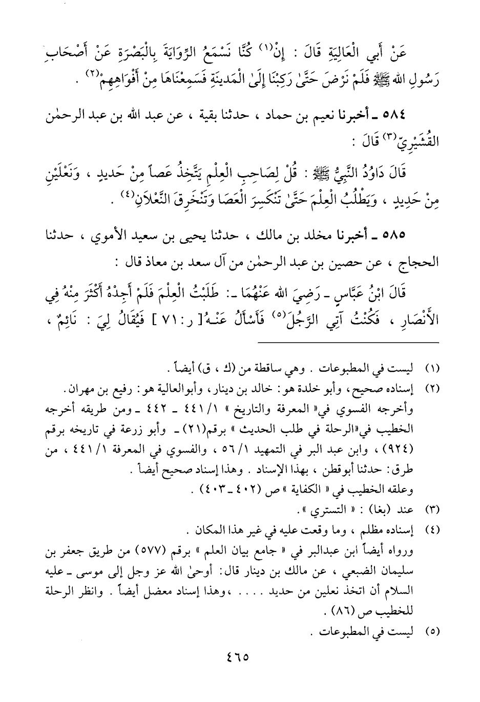 585 - أَخْبَرَنَا مَخْلَدُ بْنُ مَالِكٍ، حَدَّثَنَا يَحْيَى بْنُ سَعِيدٍ الْأُمَوِيُّ، حَدَّثَنَا الْحَجَّاجُ، عَنْ حُصَيْنِ بْنِ عَبْدِ الرَّحْمَنِ، مِنْ آلِ سَعْدِ بْنِ مُعَاذٍ قَالَ: قَالَ ابْنُ عَبَّاسٍ رَضِيَ اللَّهُ عَنْهُمَا، " §طَلَبْتُ الْعِلْمَ، فَلَمْ أَجِدْهُ أَكْثَرَ مِنْهُ فِي الْأَنْصَارِ، فَكُنْتُ آتِي الرَّجُلَ، فَأَسْأَلُ عَنْهُ، فَيُقَالُ لِي: نَائِمٌ، -[466]- فَأَتَوَسَّدُ رِدَائِي، ثُمَّ أَضْطَجِعُ حَتَّى يَخْرُجَ إِلَى الظُّهْرِ "، فَيَقُولُ: مَتَى كُنْتَ هَاهُنَا يَا ابْنَ عَمِّ رَسُولِ اللَّهِ صَلَّى اللهُ عَلَيْهِ وَسَلَّمَ؟ فَأَقُولُ: «مُنْذُ طَوِيلٍ»، فَيَقُولُ: بِئْسَ مَا صَنَعْتَ. هَلَّا أَعْلَمْتَنِي؟ فَأَقُولُ: «أَرَدْتُ أَنْ تَخْرُجَ إِلَيَّ، وَقَدْ قَضَيْتَ حَاجَتَكَ» Qفي إسناده الحجاج وهو: ابن أرطاة وهو ضعيف