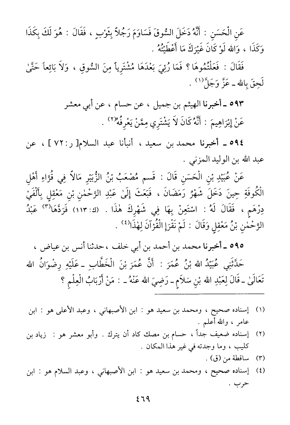 593 - أَخْبَرَنَا الْهَيْثَمُ بْنُ جَمِيلٍ، عَنْ حُسَامٍ، عَنْ أَبِي مَعْشَرٍ، عَنْ إِبْرَاهِيمَ، «أَنَّهُ كَانَ §لَا يَشْتَرِي مِمَّنْ يَعْرِفُهُ» Qإسناده ضعيف جدا حسام بن مصك كاد أن يترك