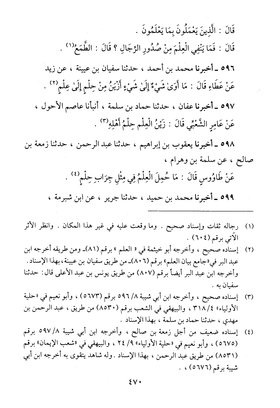 597 - أَخْبَرَنَا عَفَّانُ، حَدَّثَنَا حَمَّادُ بْنُ سَلَمَةَ، أَنبأَنَا عَاصِمٌ الْأَحْوَلُ، عَنْ عَامِرٍ الشَّعْبِيِّ، قَالَ: «§زَيْنُ الْعِلْمِ حِلْمُ أَهْلِهِ» Qإسناده صحيح