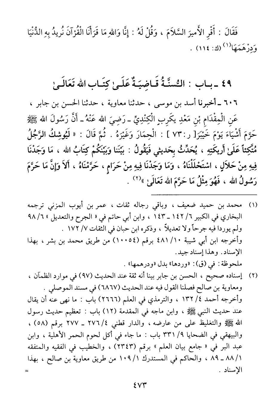 606 - أَخْبَرَنَا أَسَدُ بْنُ مُوسَى، حَدَّثَنَا مُعَاوِيَةُ، حَدَّثَنَا الْحَسَنُ بْنُ جَابِرٍ، عَنِ الْمِقْدَامِ بْنِ مَعْدِ يكَرِبَ الْكِنْدِيِّ رَضِيَ اللَّهُ عَنْهُ، أَنَّ رَسُولَ اللَّهِ صَلَّى اللهُ عَلَيْهِ وَسَلَّمَ حَرَّمَ أَشْيَاءَ يَوْمَ خَيْبَرَ الْحِمَارَ وَغَيْرَهُ. ثُمَّ قَالَ: " §لَيُوشِكُ الرَّجلِ مُتَّكِئًا عَلَى أَرِيكَتِهِ، يُحَدَّثُ بِحَدِيثِي فَيَقُولُ: بَيْنَنَا وَبَيْنَكُمْ كِتَابُ اللَّهِ، مَا وَجَدْنَا فِيهِ مِنْ حَلَالٍ، اسْتَحْلَلْنَاهُ، وَمَا وَجَدْنَا فِيهِ مِنْ حَرَامٍ، حَرَّمْنَاهُ، أَلَا وَإِنَّ مَا حَرَّمَ رَسُولُ اللَّهِ، فهُوَ مِثْلُ مَا حَرَّمَ اللَّهُ تَعَالَى "Qإسناده صحيح