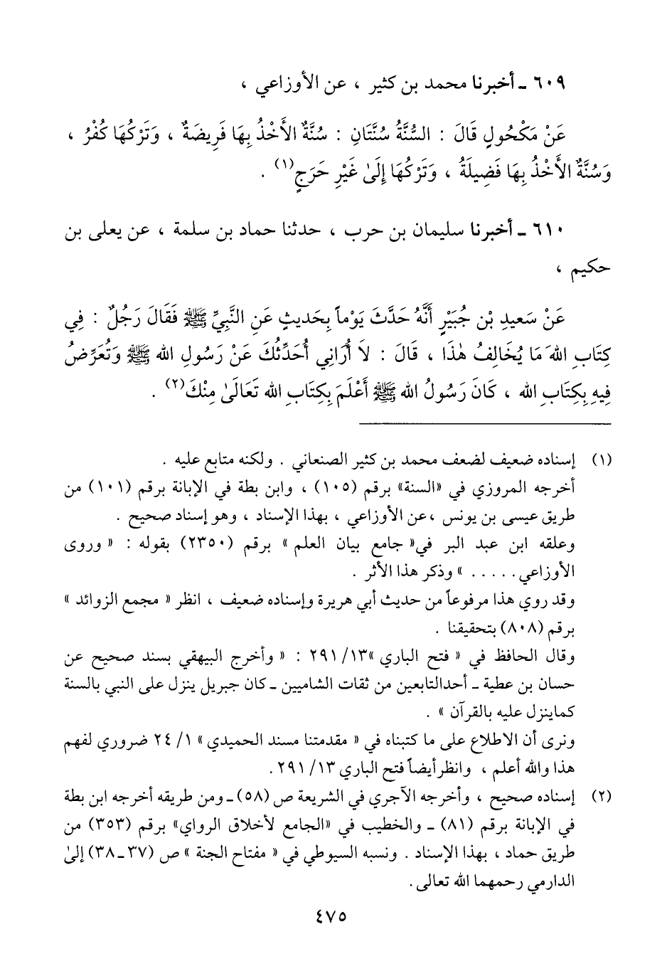 609 - أَخْبَرَنَا مُحَمَّدُ بْنُ كَثِيرٍ، عَنِ الْأَوْزَاعِيِّ، عَنْ مَكْحُولٍ قَالَ: " §السُّنَّةُ سُنَّتَانِ: سُنَّةٌ الْأَخْذُ بِهَا فَرِيضَةٌ، وَتَرْكُهَا كُفْرٌ، وَسُنَّةٌ الْأَخْذُ بِهَا فَضِيلَةٌ، وَتَرْكُهَا إِلَى غَيْرِ حَرَجٍ "Qإسناده ضعيف لضعف محمد بن كثير الصنعاني