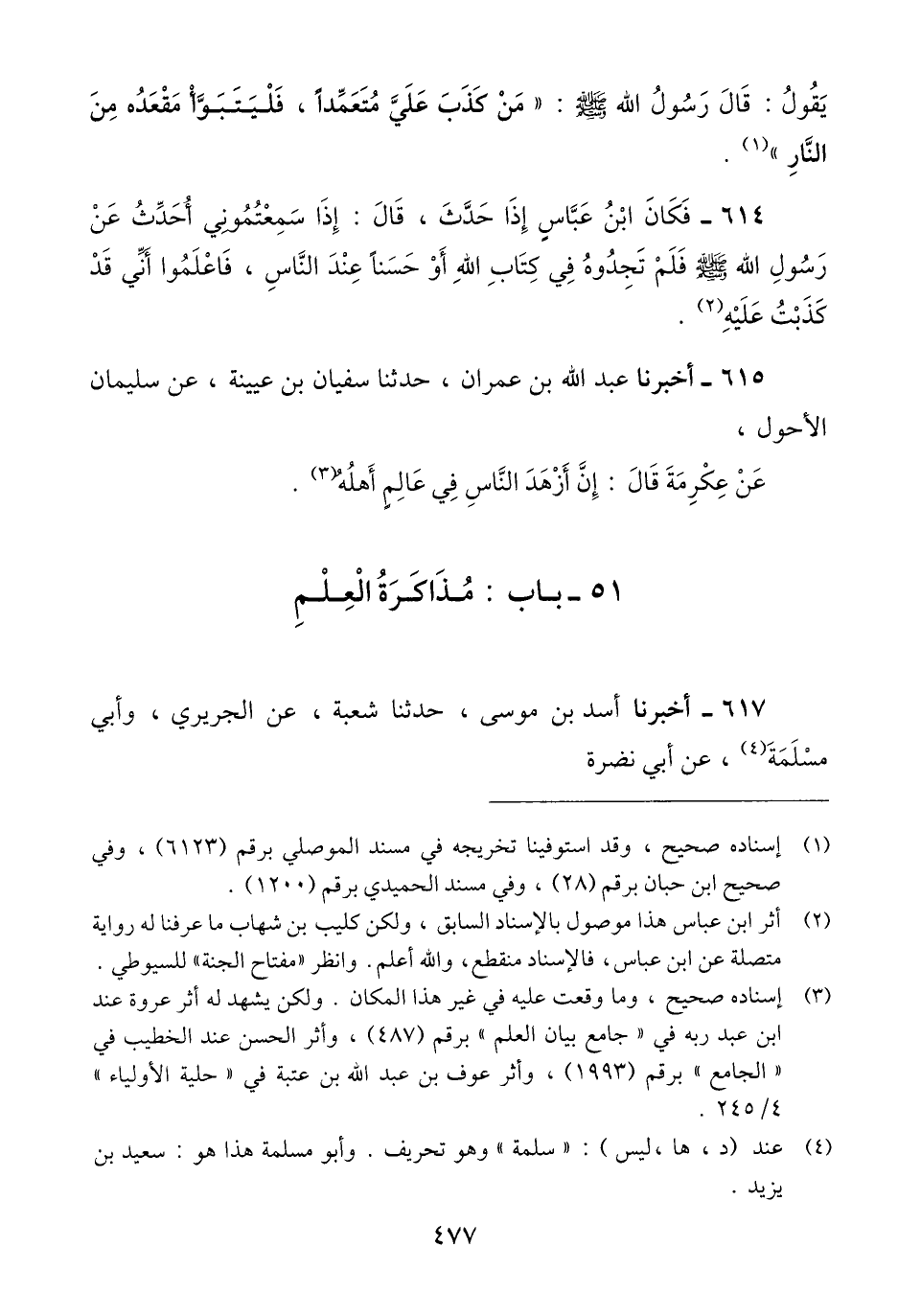 617 - أَخْبَرَنَا أَسَدُ بْنُ مُوسَى، حَدَّثَنَا شُعْبَةُ، عَنِ الْجُرَيْرِيِّ، وَأَبِي مَسْلَمَةَ، عَنْ أَبِي نَضْرَةَ، -[478]- عَنْ أَبِي سَعِيدٍ الْخُدْرِيِّ رَضِيَ اللَّهُ عَنْهُ، قَالَ: «§تَذَاكَرُوا الْحَدِيثَ، فَإِنَّ الْحَدِيثَ يُهَيِّجُ الْحَدِيثَ» Qإسناده صحيح