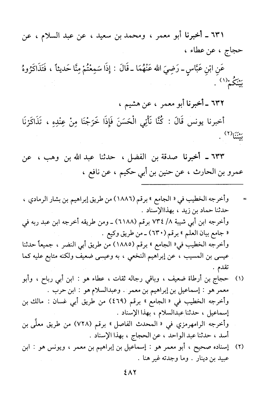 631 - أَخْبَرَنَا أَبُو مَعْمَرٍ، وَمُحَمَّدُ بْنُ سَعِيدٍ، عَنْ عَبْدِ السَّلَامِ، عَنْ حَجَّاجٍ، عَنْ عَطَاءٍ، عَنِ ابْنِ عَبَّاسٍ رَضِيَ اللَّهُ عَنْهُمَا، قَالَ: «§إِذَا سَمِعْتُمْ مِنَّا حَدِيثًا، فَتَذَاكَرُوهُ بَيْنَكُمْ» Qحجاج بن أرطاة ضعيف