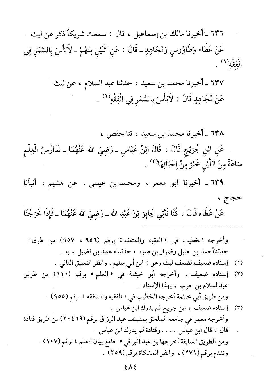 636 - أَخْبَرَنَا مَالِكُ بْنُ إِسْمَاعِيلَ، قَالَ: سَمِعْتُ شَرِيكًا، ذَكَرَ عَنْ لَيْثٍ، عَنْ عَطَاءٍ، وَطَاوُسٍ، وَمُجَاهِدٍ - قَالَ: عَنِ اثْنَيْنِ مِنْهُمْ - «§لَا بَأْسَ بِالسَّمَرِ فِي الْفِقْهِ» Qإسناده ضعيف لضعف ليث وهو: ابن أبي سليم