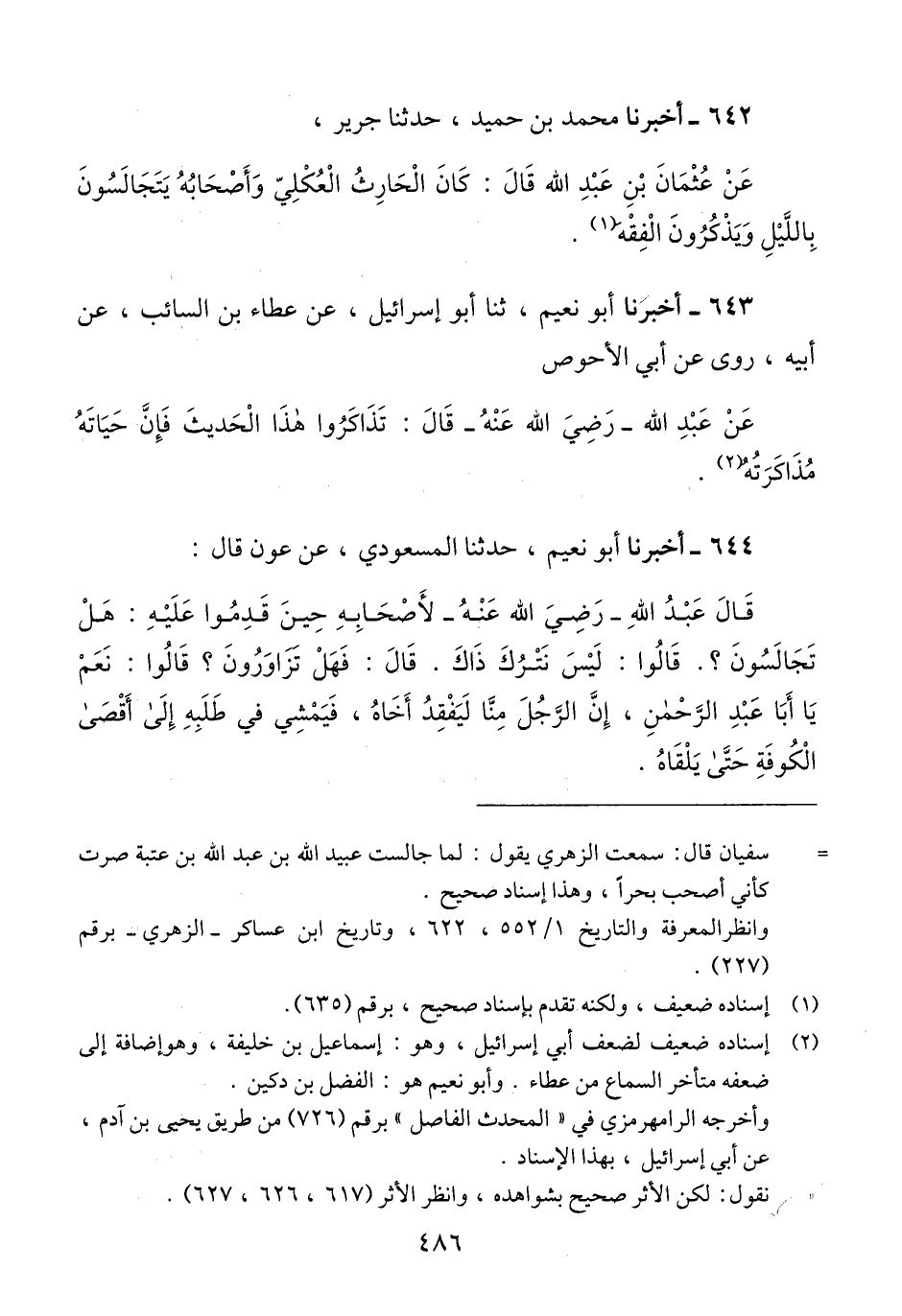 643 - أَخْبَرَنَا أَبُو نُعَيْمٍ، ثَنَا أَبُو إِسْرَائِيلَ، عَنْ عَطَاءِ بْنِ السَّائِبِ، عَنْ أَبِيهِ، رَوَى عَنْ أَبِي الْأَحْوَصِ، عَنْ عَبْدِ اللَّهِ رَضِيَ اللَّهُ عَنْهُ، قَالَ: «§تَذَاكَرُوا هَذَا الْحَدِيثَ، فَإِنَّ حَيَاتَهُ مُذَاكَرَتُهُ» Qإسناده ضعيف لضعف أبي إسرائيل وهو: إسماعيل بن خليفة لكن الأثر صحيح بشواهده