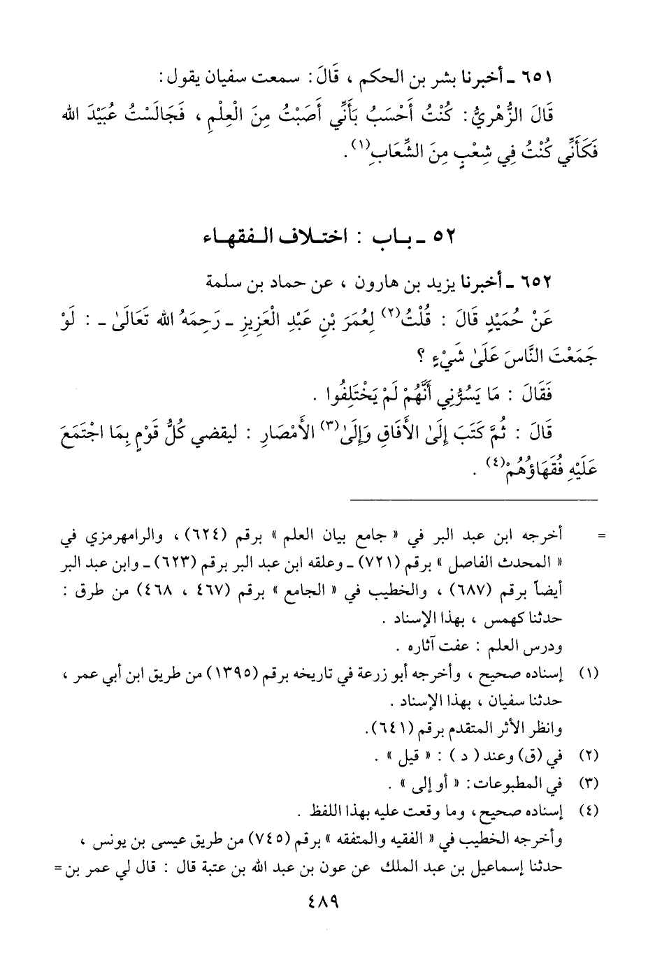652 - أَخْبَرَنَا يَزِيدُ بْنُ هَارُونَ، عَنْ حَمَّادِ بْنِ سَلَمَةَ، عَنْ حُمَيْدٍ، قَالَ: قِلتَ لِعُمَرَ بْنِ عَبْدِ الْعَزِيزِ رَحِمَهُ اللَّهُ تَعَالَى: لَوْ جَمَعْتَ النَّاسَ عَلَى شَيْءٍ؟ فَقَالَ: «مَا يَسُرُّنِي أَنَّهُمْ لَمْ يَخْتَلِفُوا» قَالَ: ثُمَّ كَتَبَ إِلَى الْآفَاقِ وَإِلَى الْأَمْصَارِ: §لِيَقْضِ كُلُّ قَوْمٍ، بِمَا اجْتَمَعَ عَلَيْهِ فُقَهَاؤُهُمْ "Qإسناده صحيح