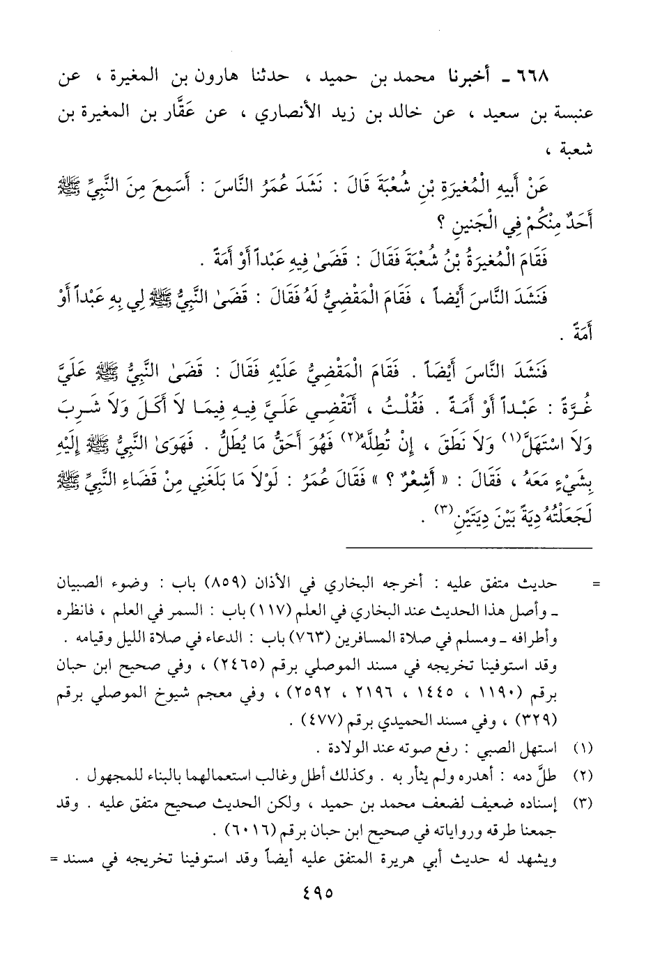 668 - أَخْبَرَنَا مُحَمَّدُ بْنُ حُمَيْدٍ، حَدَّثَنَا هَارُونُ بْنُ الْمُغِيرَةِ، عَنْ عَنْبَسَةَ بْنِ سَعِيدٍ، عَنْ خَالِدِ بْنِ زَيْدٍ الْأَنْصَارِيِّ، عَنْ عَقَّارِ بْنِ الْمُغِيرَةِ بْنِ شُعْبَةَ، عَنْ أَبِيهِ الْمُغِيرَةِ بْنِ شُعْبَةَ، قَالَ: نَشَدَ عُمَرُ النَّاسَ أَسَمِعَ مِنَ النَّبِيِّ صَلَّى اللهُ عَلَيْهِ وَسَلَّمَ أَحَدٌ مِنْكُمْ فِي الْجَنِينِ؟ فَقَامَ الْمُغِيرَةُ بْنُ شُعْبَةَ فَقَالَ: §قَضَى فِيهِ عَبْدًا أَوْ أَمَةً. فَنَشَدَ النَّاسَ أَيْضًا. فَقَامَ الْمَقْضِيُّ لَهُ فَقَالَ: قَضَى النَّبِيُّ صَلَّى اللهُ عَلَيْهِ وَسَلَّمَ لِي بِهِ عَبْدًا أَوْ أَمَةً، فَنَشَدَ النَّاسَ أَيْضًا، فَقَامَ الْمَقْضِيُّ عَلَيْهِ فَقَالَ: قَضَى النَّبِيُّ صَلَّى اللهُ عَلَيْهِ وَسَلَّمَ عَلَيَّ غُرَّةً عَبْدًا أَوْ أَمَةً فَقُلْتُ: أَتَقْضِي عَلَيَّ فِيهِ فِيمَا لَا أَكَلَ، وَلَا شَرِبَ، وَلَا اسْتَهَلَّ، وَلَا نَطَقَ، إِنْ تُطِلَّهُ، فَهُوَ أَحَقُّ مَا يُطَلُّ، فَهَوَى النَّبِيُّ صَلَّى اللهُ عَلَيْهِ وَسَلَّمَ إِلَيْهِ بِشَيْءٍ مَعَهُ، فَقَالَ «أَشِعْرٌ» فَقَالَ عُمَرُ لَوْلَا مَا بَلَغَنِي مِنْ قَضَاءِ النَّبِيِّ صَلَّى اللهُ عَلَيْهِ وَسَلَّمَ لَجَعَلْتُهُ دِيَةً بَيْنَ دِيَتَيْنِQالحديث صحيح متفق عليه