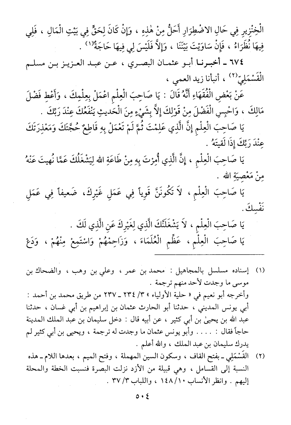 674 - أَخْبَرَنَا أَبُو عُثْمَانَ الْبَصْرِيُّ، عَنْ عَبْدِ الْعَزِيزِ بْنِ مُسْلِمٍ الْقَسْمَلِيِّ، أنْبأنا زَيْدٌ الْعَمِّيُّ، عَنْ بَعْضِ الْفُقَهَاءِ، أَنَّهُ قَالَ: «§يَا صَاحِبَ الْعِلْمِ اعْمَلْ بِعِلْمِكَ، وَأَعْطِ فَضْلَ مَالِكَ، وَاحْبِسِ الْفَضْلَ مِنْ قَوْلِكَ، إِلَّا بِشَيْءٍ مِنَ الْحَدِيثِ يَنْفَعُكَ عِنْدَ رَبِّكَ. يَا صَاحِبَ الْعِلْمِ إِنَّ الَّذِي عَلِمْتَ ثُمَّ لَمْ تَعْمَلْ بِهِ قَاطِعٌ حُجَّتَكَ، وَمَعْذِرَتَكَ عِنْدِ رَبِّكَ إِذَا لَقِيتَهُ، يَا صَاحِبَ الْعِلْمِ، إِنَّ الَّذِي أُمِرْتَ بِهِ مِنْ طَاعَةِ اللَّهِ، لَيَشْغَلُكَ عَمَّا نُهِيتَ عَنْهُ مِنْ مَعْصِيَةِ اللَّهِ. يَا صَاحِبَ الْعِلْمِ، لَا تَكُونَنَّ قَوِيًّا فِي عَمَلِ غَيْرِكَ، ضَعِيفًا فِي عَمَلِ نَفْسِكَ. يَا صَاحِبَ الْعِلْمِ، لَا يَشْغَلَنَّكَ الَّذِي لِغَيْرِكَ عَنِ الَّذِي لَكَ. يَا صَاحِبَ الْعِلْمِ، عَظِّمِ الْعُلَمَاءَ، وَزَاحِمْهُمْ وَاسْتَمِعْ مِنْهُمْ، وَدَعْ -[505]- مُنَازَعَتَهُمْ، يَا صَاحِبَ الْعِلْمِ، عظِّمِ الْعُلَمَاءَ لِعِلْمِهِمْ، وَصَغِّرِ الْجُهَّالَ لِجَهْلِهِمْ، وَلَا تُبَاعِدْهُمْ، وَقَرِّبْهُمْ وَعَلِّمْهُمْ. يَا صَاحِبَ الْعِلْمِ، لَا تُحَدِّثْ بِحَدِيثٍ فِي مَجْلِسٍ، حَتَّى تَفْهَمَهُ، وَلَا تُجِبِ امْرَأً فِي قَوْلِهِ حَتَّى تَعْلَمَ مَا قَالَ لَكَ، يَا صَاحِبَ الْعِلْمِ، لَا تَغْتَرَّ بِاللَّهِ، وَلَا تَغْتَرَّ بِالنَّاسِ، فَإِنَّ الْغِرَّةَ بِاللَّهِ تَرْكُ أَمْرِهِ، وَالْغِرَّةَ بِالنَّاسِ اتِّبَاعُ أَهْوَائِهِمْ، وَاحْذَرْ مِنَ اللَّهِ، مَا حَذَّرَكَ مِنْ نَفْسِهِ، وَاحْذَرْ مِنَ النَّاسِ فِتْنَتَهُمْ. يَا صَاحِبَ الْعِلْمِ، إِنَّهُ لَا يَكْمُلُ ضَوْءُ النَّهَارِ إِلَّا بِالشَّمْسِ، كَذَلِكَ لَا تَكْمُلُ الْحِكْمَةُ إِلَّا بِطَاعَةِ اللَّهِ، يَا صَاحِبَ الْعِلْمِ، إِنَّهُ لَا يَصْلُحُ الزَّرْعُ، إِلَّا بِالْمَاءِ وَالتُّرَابِ، كَذَلِكَ لَا يَصْلُحُ الْإِيمَانُ، إِلَّا بِالْعِلْمِ وَالْعَمَلِ، يَا صَاحِبَ الْعِلْمِ، كُلُّ مُسَافِرٍ مُتَزَوِّدٌ، وَسَيَجِدُ إِذَا احْتَاجَ إِلَى زَادٍ، مَا تَزَوَّدَ، وَكَذَلِكَ سَيَجِدُ كُلُّ عَامِلٍ إِذَا مَا احْتَاجَ إِلَى عَمَلِهِ فِي الْآخِرَةِ، مَا عَمِلَ فِي الدُّنْيا، يَا صَاحِبَ الْعِلْمِ، إِذَا أَرَادَ اللَّهُ أَنْ يَحُضَّكَ عَلَى عِبَادَتِهِ، فَاعْلَمْ أَنَّهُ إِنَّمَا أَرَادَ أَنْ يُبَيِّنَ لَكَ كَرَامَتَكَ عَلَيْهِ، فَلَا تَحَوَّلَنَّ إِلَى غَيْرِهِ، فَتَرْجِعَ مِنْ -[506]- كَرَامَتِهِ إِلَى هَوَانِهِ. يَا صَاحِبَ الْعِلْمِ، إِنَّكَ إِنْ تَنْقُلِ الْحِجَارَةَ وَالْحَدِيدَ، أَهْوَنُ عَلَيْكَ مِنْ أَنْ تُحَدِّثَ مَنْ لَا يَعْقِلُ حَدِيثَكَ، وَمَثَلُ الَّذِي يُحَدِّثُ مَنْ لَا يَعْقِلُ حَدِيثَهُ، كَمَثَلِ الَّذِي يُنَادِي الْمَيِّتَ، وَيَضَعُ الْمَائِدَةَ لِأَهْلِ الْقُبُورِ»