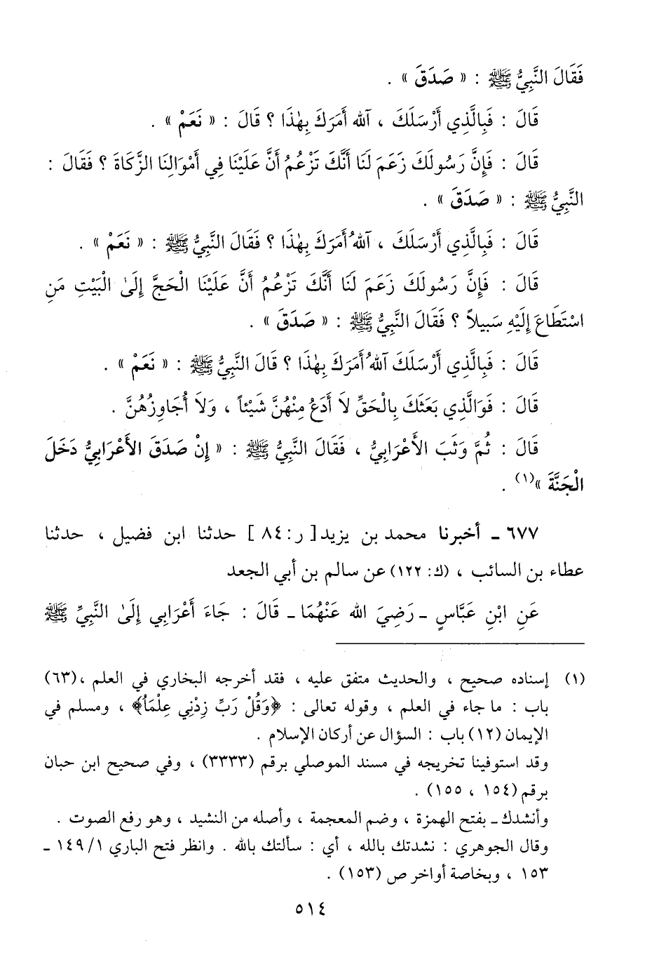 677 - أَخْبَرَنَا مُحَمَّدُ بْنُ يَزِيدَ، حَدَّثَنَا ابْنُ فُضَيْلٍ، حَدَّثَنَا عَطَاءُ بْنُ السَّائِبِ، عَنْ سَالِمِ بْنِ أَبِي الْجَعْدِ، عَنِ ابْنِ عَبَّاسٍ رَضِيَ اللَّهُ عَنْهُمَا، قَالَ: جَاءَ أَعْرَابِيٌّ إِلَى النَّبِيِّ صَلَّى اللهُ عَلَيْهِ وَسَلَّمَ -[515]- فَقَالَ: السَّلَامُ عَلَيْكَ يَا غُلَامَ بَنِي عَبْدِ الْمُطَّلِبِ. فَقَالَ: «وَعَلَيْكَ». قَالَ: إِنِّي رَجُلٌ مِنْ أَخْوَالِكَ مِنْ بَنِي سَعْدِ بْنِ بَكْرٍ، وَأَنَا رَسُولُ قَوْمِي إِلَيْكَ وَوَافِدُهُمْ، وَإِنِّي سَائِلُكَ فَمُشَدِّدٌ مَسْأَلَتِي عَلَيْكَ، وَمُنَاشِدُكَ فَمُشَدِّدٌ مُنَاشَدَتِي إِيَّاكَ. قَالَ: «خُذْ عَنْكَ يَا أَخَا بَنِي سَعْدٍ» قَالَ: مَنْ خَلَقَكَ، وَخَلَقَ مَنْ قَبْلَكَ، وَمَنْ هُوَ خَالِقُ مَنْ بَعْدَكَ؟ قَالَ: «اللَّهُ» قَالَ: فَنَشَدْتُكَ بِذَلِكَ، أَهُوَ أَرْسَلَكَ؟ قَالَ: «نَعَمْ». قَالَ: مَنْ خَلَقَ السَّمَاوَاتِ السَّبْعَ وَالْأَرَضِينَ السَّبْعَ، وَأَجْرَى بَيْنَهُنَّ الرِّزْقَ؟ قَالَ: «اللَّهُ». قَالَ: فَنَشَدْتُكَ بِذَلِكَ، أَهُوَ أَرْسَلَكَ؟ قَالَ: «نَعَمْ». قَالَ: إِنَّا وَجَدْنَا فِي كِتَابِكَ، وَأَمَرَتْنَا رُسُلُكَ أَنْ نُصَلِّيَ فِي الْيَوْمِ وَاللَّيْلَةِ خَمْسَ صَلَوَاتٍ لِمَوَاقِيتِهَا، فَنَشَدْتُكَ بِذَلِكَ، أَهُوَ أَمَرَكَ؟ قَالَ: «نَعَمْ». قَالَ: فَإِنَّا وَجَدْنَا فِي كِتَابِكَ، وَأَمَرَتْنَا رُسُلُكَ أَنْ نَأْخُذَ مِنْ حَوَاشِي أَمْوَالِنَا، فَنَرُدَّهَا عَلَى فُقَرَائِنَا، فَنَشَدْتُكَ بِذَلِكَ، أَهُوَ أَمَرَكَ بِذَلِكَ؟ قَالَ: «نَعَمْ». ثُمَّ قَالَ: أَمَا الْخَامِسَةُ، فَلَسْتُ بِسَائِلِكَ عَنْهَا، وَلَا إربَ لِي فِيهَا. ثُمَّ قَالَ: أَمَّا وَالَّذِي بَعَثَكَ بِالْحَقِّ، لَأَعْمَلَنَّ بِهَا وَمَنْ أَطَاعَنِي مِنْ قَوْمِي، ثُمَّ رَجَعَ. -[516]- فَضَحِكَ النَّبِيُّ صَلَّى اللهُ عَلَيْهِ وَسَلَّمَ حَتَّى بَدَتْ نَوَاجِذُهُ، ثُمَّ قَالَ: «وَالَّذِي نَفْسِي بِيَدِهِ، §لَئِنْ صَدَقَ، لَيَدْخُلَنَّ الْجَنَّةَ» Qإسناده ضعيف محمد بن فضيل متأخر السماع من عطاء