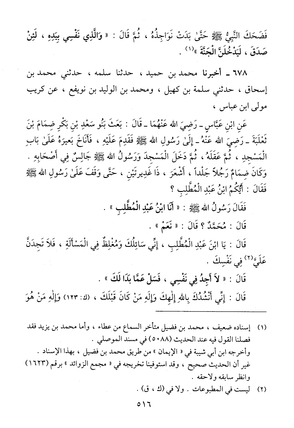 678 - أَخْبَرَنَا مُحَمَّدُ بْنُ حُمَيْدٍ، حَدَّثَنَا سَلَمَةُ، حَدَّثَنِي مُحَمَّدُ بْنُ إِسْحَاقَ، حَدَّثَنِي سَلَمَةُ بْنُ كُهَيْلٍ، وَمُحَمَّدُ بْنُ الْوَلِيدِ بْنِ نُوَيْفِعٍ، عَنْ كُرَيْبٍ، مَوْلَى ابْنِ عَبَّاسٍ عَنِ ابْنِ عَبَّاسٍ رَضِيَ اللَّهُ عَنْهُمَا، قَالَ: بَعَثَ بَنُو سَعْدِ بْنِ بَكْرٍ ضِمَامَ بْنَ ثَعْلَبَةَ رَضِيَ اللَّهُ عَنْهُ إِلَى رَسُولُ اللَّهِ صَلَّى اللهُ عَلَيْهِ وَسَلَّمَ فَقَدِمَ عَلَيْهِ، فَأَنَاخَ بَعِيرَهُ عَلَى بَابِ الْمَسْجِدِ، ثُمَّ عَقَلَهُ، ثُمَّ دَخَلَ الْمَسْجِدَ وَرَسُولُ اللَّهِ صَلَّى اللهُ عَلَيْهِ وَسَلَّمَ جَالِسٌ فِي أَصْحَابِهِ، وَكَانَ ضِمَامٌ رَجُلًا جَلْدًا، أَشْعَرَ، ذَا غَدِيرَتَيْنِ، حَتَّى وَقَفَ عَلَى رَسُولِ اللَّهِ صَلَّى اللهُ عَلَيْهِ وَسَلَّمَ، فَقَالَ: أَيُّكُمُ ابْنُ عَبْدِ الْمُطَّلِبِ؟ فَقَالَ رَسُولُ اللَّهِ صَلَّى اللهُ عَلَيْهِ وَسَلَّمَ: «أَنَا ابْنُ عَبْدِ الْمُطَّلِبِ»، قَالَ: مُحَمَّدٌ؟ قَالَ: «نَعَمْ». قَالَ: يَا ابْنَ عَبْدِ الْمُطَّلِبِ، إِنِّي سَائِلُكَ وَمُغَلِّظٌ فِي الْمَسْأَلَةِ، فَلَا تَجِدَنَّ عَلَيَّ فِي نَفْسِكَ، قَالَ: «لَا أَجِدُ فِي نَفْسِي، فَسَلْ عَمَّا بَدَا لَكَ» قَالَ: إِنِّي أَنْشُدُكَ بِاللَّهِ إِلَهِكَ وَإِلَهِ مَنْ كَانَ قَبْلَكَ، وَإِلَهِ مَنْ هُوَ -[517]- كَائِنٌ بَعْدَكَ، آللَّهُ بَعَثَكَ إِلَيْنَا رَسُولًا؟ قَالَ: «اللَّهُمَّ نَعَمْ»، قَالَ: فَأَنْشُدُكَ بِاللَّهِ إِلَهِكَ وَإِلَهِ مَنْ كَانَ قَبْلَكَ، وَإِلَهِ مَنْ كَائِنٌ بَعْدَكَ، آللَّهُ أَمَرَكَ أَنْ نَعْبُدَهُ وَحْدَهُ لَا نُشْرِكُ بِهِ شَيْئًا، وَأَنْ نَخْلَعَ هَذِهِ الْأَنْدَادَ الَّتِي كَانَتْ آبَاؤُنَا تَعْبُدُهَا مِنْ دُونِهِ؟ قَالَ: «اللَّهُمَّ نَعَمْ» قَالَ: فَأَنْشُدُكَ بِاللَّهِ إِلَهِكَ وَإِلَهِ مَنْ كَانَ قَبْلَكَ، وَإِلَهِ مَنْ هُوَ كَائِنٌ بَعْدَكَ، آللَّهُ أَمَرَكَ أَنْ نُصَلِّيَ هَذِهِ الصَّلَوَاتِ الْخَمْسَ؟ قَالَ: «اللَّهُمَّ نَعَمْ»، قَالَ: ثُمَّ جَعَلَ يَذْكُرُ فَرَائِضَ الْإِسْلَامِ فَرِيضَةً فَرِيضَةً الزَّكَاةَ، وَالصِّيَامَ، وَالْحَجَّ، وَشَرَائِعَ الْإِسْلَامِ كُلَّهَا، وَيُنَاشِدُهُ عِنْدَ كُلِّ فَرِيضَةٍ، كَمَا نَاشَدَهُ فِي الَّتِي قَبْلَهَا حَتَّى إِذَا فَرَغَ، قَالَ: فَإِنِّي أَشْهَدُ أَنْ لَا إِلَهَ إِلَّا اللَّهُ، وَأَشْهَدُ أَنَّ مُحَمَّدًا عَبْدُهُ وَرَسُولُهُ، وَسَأُؤَدِّي هَذِهِ الْفَرِيضَةَ، وَأَجْتَنِبُ مَا نَهَيْتَنِي عَنْهُ، ثُمَّ قَالَ: لَا أَزِيدُ وَلَا أُنْقِصُ، ثُمَّ انْصَرَفَ إِلَى بَعِيرِهِ، فَقَالَ رَسُولِ اللَّهِ صَلَّى اللهُ عَلَيْهِ وَسَلَّمَ حِينَ وَلَّى: «§إِنْ يَصْدُقْ ذُو الْعَقِيصَتَيْنِ، يَدْخُلِ الْجَنَّةَ»، فَأَتَى إِلَى بَعِيرِهِ فَأَطْلَقَ عِقَالَهُ، ثُمَّ خَرَجَ حَتَّى قَدِمَ عَلَى قَوْمِهِ فَاجْتَمَعُوا إِلَيْهِ، فَكَانَ أَوَّلَ مَا تَكَلَّمَ أَنْ قَالَ: بِئسْتِ اللَّاتُ وَالْعُزَّى، قَالُوا: مَهْ يَا ضِمَامُ، اتَّقِ الْبَرَصَ، وَاتَّقِ الْجُنُونَ، وَاتَّقِ الْجُذَامَ، قَالَ: وَيْلَكُمْ، إِنَّهُمَا وَاللَّهِ لَا تَضُرَّانِ وَلَا تَنْفَعَانِ، إِنَّ اللَّهَ قَدْ بَعَثَ رَسُولًا، وَأَنْزَلَ عَلَيْهِ كِتَابًا اسْتَنْقَذَكُمْ بِهِ مِمَّا كُنْتُمْ فِيهِ، وَإِنِّي أَشْهَدُ أَنْ لَا إِلَهَ إِلَّا اللَّهُ، وَأَنَّ مُحَمَّدًا عَبْدُهُ وَرَسُولُهُ، وَقَدْ جِئْتُكُمْ مِنْ عِنْدِهِ بِمَا أَمَرَكُمْ بِهِ، -[518]- وَنَهَاكُمْ عنْهُ، قَالَ: فَوَاللَّهِ مَا أَمْسَى مِنْ ذَلِكَ الْيَوْمِ، وَفِي حَاضِرِهِ رَجُلٌ وَلَا امْرَأَةٌ، إِلَّا مُسْلِمًا، قَالَ: يَقُولُ ابْنُ عَبَّاسٍ: فَمَا سَمِعْنَا بِوَافِدِ قَوْمٍ كَانَ أَفْضَلَ مِنْ ضِمَامِ بْنِ ثَعْلَبَةَQإسناده