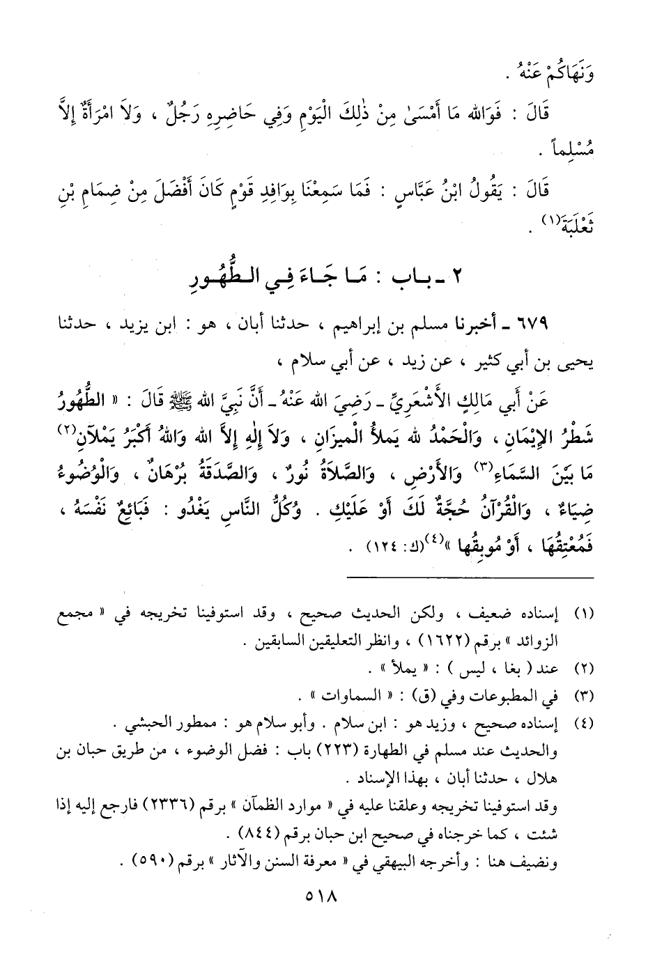 679 - أَخْبَرَنَا مُسْلِمُ بْنُ إِبْرَاهِيمَ، حَدَّثَنَا أَبَانُ هُوَ ابْنُ يَزِيدَ، حَدَّثَنَا يَحْيَى بْنُ أَبِي كَثِيرٍ، عَنْ زَيْدٍ، عَنْ أَبِي سَلَّامٍ، عَنْ أَبِي مَالِكٍ الْأَشْعَرِيِّ رَضِيَ اللَّهُ عَنْهُ، أَنَّ نَبِيَّ اللَّهُ صَلَّى اللهُ عَلَيْهِ وَسَلَّمَ قَالَ: " §الطُّهُورُ شَطْرُ الْإِيمَانِ، وَالْحَمْدُ لِلَّهِ يَمْلَأُ الْمِيزَانَ، وَلَا إِلَهَ إِلَّا اللَّهُ وَاللَّهُ أَكْبَرُ يَمْلَآَنِ مَا بَيْنَ السَّمَاءِ، وَالْأَرْضِ، وَالصَّلَاةُ نُورٌ، وَالصَّدَقَةُ بُرْهَانٌ، وَالْوُضُوءُ ضِيَاءٌ، وَالْقُرْآنُ حُجَّةٌ لَكَ أَوْ عَلَيْكَ. وَكُلُّ النَّاسِ يَغْدُو: فَبَائِعٌ نَفْسَهُ، فَمُعْتِقُهَا، أَوْ مُوبِقُهَا "Qإسناده صحيح
