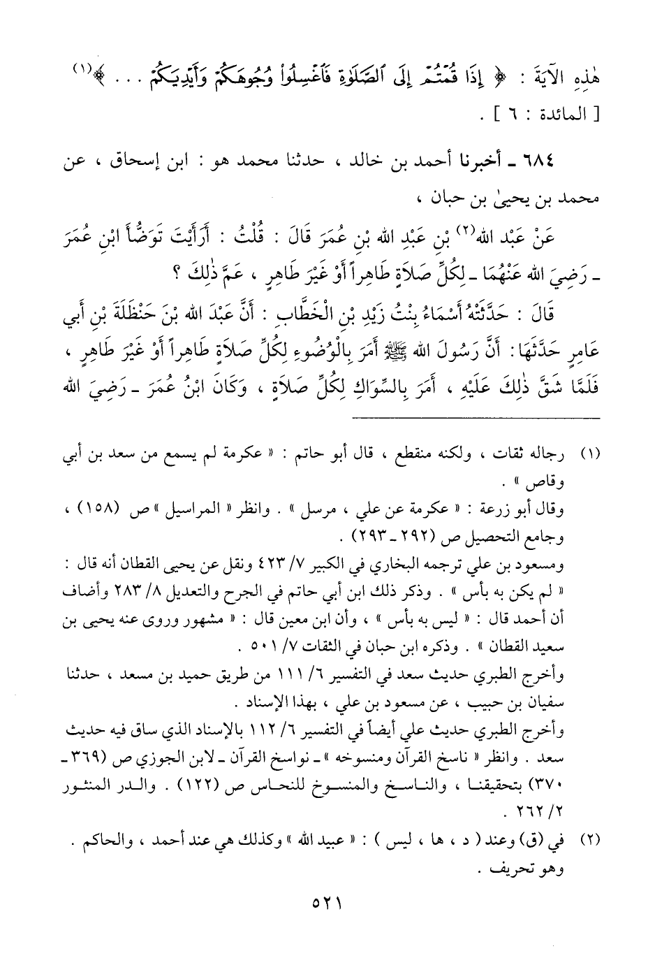 684 - أَخْبَرَنَا أَحْمَدُ بْنُ خَالِدٍ، حَدَّثَنَا مُحَمَّدٌ هُوَ ابْنُ إِسْحَاقَ، عَنْ مُحَمَّدِ بْنِ يَحْيَى بْنِ حَبَّانَ، عَنْ عَبْدِ اللَّهِ بْنِ عَبْدِ اللَّهِ بْنِ عُمَرَ، قَالَ: قُلْتُ: أَرَأَيْتَ تَوَضُّأَ ابْنِ عُمَرَ رَضِيَ اللَّهُ عَنْهُمَا لِكُلِّ صَلَاةٍ طَاهِرًا أَوْ غَيْرَ طَاهِرٍ، عَمَّ ذَلِكَ؟ قَالَ: حَدَّثَتْهُ أَسْمَاءُ بِنْتُ زَيْدِ بْنِ الْخَطَّابِ، أَنَّ عَبْدَ اللَّهِ بْنَ حَنْظَلَةَ بْنِ أَبِي عَامِرٍ، حَدَّثَهَا: أَنَّ رَسُولَ اللَّهِ صَلَّى اللهُ عَلَيْهِ وَسَلَّمَ «§أُمِرَ بِالْوُضُوءِ لِكُلِّ صَلَاةٍ، طَاهِرًا أَوْ غَيْرَ طَاهِرٍ، فَلَمَّا شَقَّ ذَلِكَ عَلَيْهِ، أُمِرَ بِالسِّوَاكِ لِكُلِّ صَلَاةٍ» وَكَانَ ابْنُ عُمَرَ رَضِيَ اللَّهُ -[522]- عَنْهُمَا، يَرَى أَنَّ بِهِ عَلَى ذَلِكَ قُوَّةً، فَكَانَ لَا يَدَعُ الْوُضُوءَ لِكُلِّ صَلَاةٍQإسناده صحيح