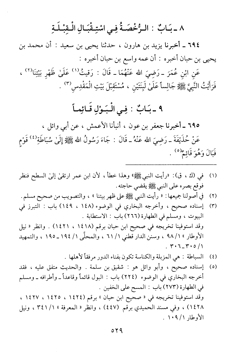 694 - أَخْبَرَنَا يَزِيدُ بْنُ هَارُونَ، حَدَّثَنَا يَحْيَى بْنُ سَعِيدٍ، أَنَّ مُحَمَّدَ بْنَ يَحْيَى بْنِ حَبَّانَ، أَخْبَرَهُ أَنَّ عَمَّهُ وَاسِعَ بْنَ حَبَّانَ، أَخْبَرَهُ: عَنِ ابْنِ عُمَرَ رَضِيَ اللَّهُ عَنْهُمَا، قَالَ: §رَقَيْتُ عَََلَى ظَهْرِ بَيْتِنَا فَرَأَيْتُ النَّبِيَّ صَلَّى اللهُ عَلَيْهِ وَسَلَّمَ عَلَى ظَهْرِ بَيْتِنَا فَرَأَيْتُ النَّبِيَّ صَلَّى اللهُ عَلَيْهِ وَسَلَّمَ جَالِسًا عَلَى لَبِنَتَيْنِ، مُسْتَقْبِلَ بَيْتِ الْمَقْدِسِ "Qإسناده صحيح