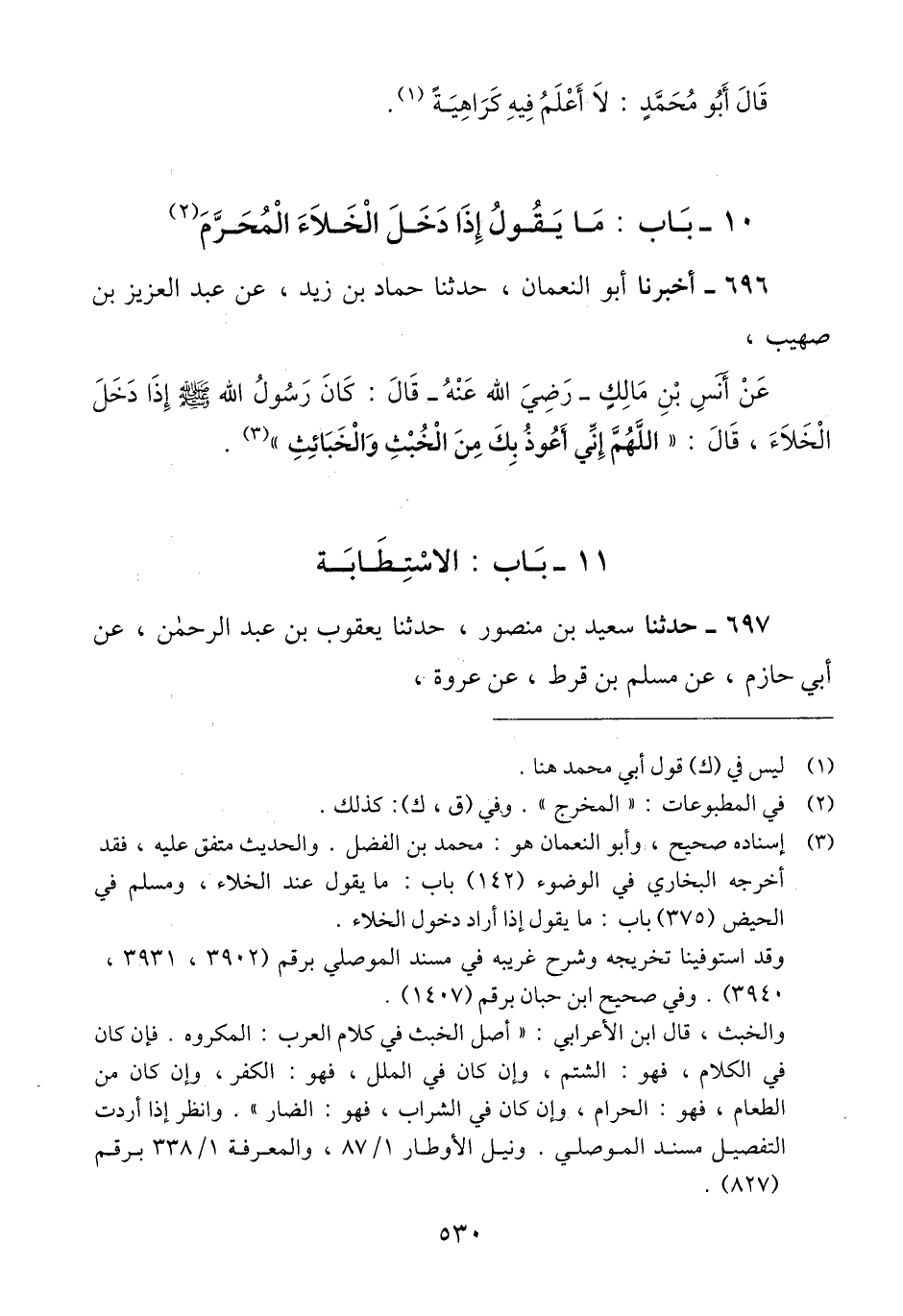 696 - أَخْبَرَنَا أَبُو النُّعْمَانِ، حَدَّثَنَا حَمَّادُ بْنُ زَيْدٍ، عَنْ عَبْدِ الْعَزِيزِ بْنِ صُهَيْبٍ، عَنْ أَنَسِ بْنِ مَالِكٍ رَضِيَ اللَّهُ عَنْهُ، قَالَ: كَانَ رَسُولُ اللَّهِ صَلَّى اللهُ عَلَيْهِ وَسَلَّمَ إِذَا دَخَلَ الْخَلَاءَ، قَالَ: «§اللَّهُمَّ إِنِّي أَعُوذُ بِكَ مِنَ الْخُبْثِ وَالْخَبَائِثِ» Qإسناده صحيح