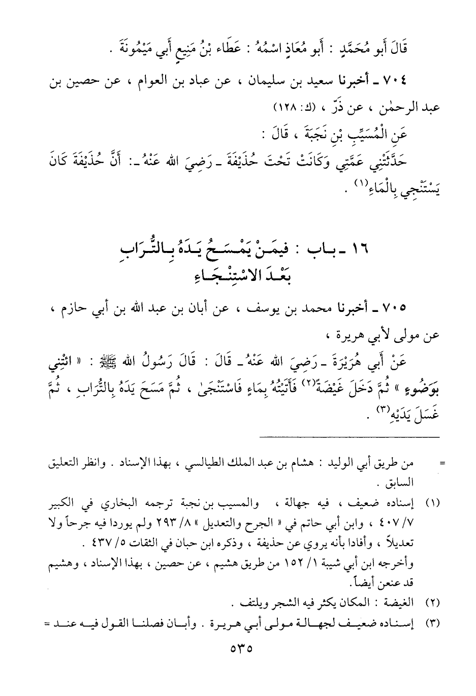 704 - أَخْبَرَنَا سَعِيدُ بْنُ سُلَيْمَانَ، عَنْ عَبَّادِ بْنِ الْعَوَّامِ، عَنْ حُصَيْنِ بْنِ عَبْدِ الرَّحْمَنِ، عَنْ ذَرٍّ، عَنِ حَنْظَلَةَ بْنِ سَبْرَةَ بْنِ الْمُسَيَّبِ بْنِ نَجَبَةَ، قَالَ: حَدَّثَتْنِي عَمَّتِي، وَكَانَتْ تَحْتَ حُذَيْفَةَ رَضِيَ اللَّهُ عَنْهُ: أَنَّ حُذَيْفَةَ، كَانَ «§يَسْتَنْجِي بِالْمَاءِ» Qإسناده ضعيف فيه جهالة