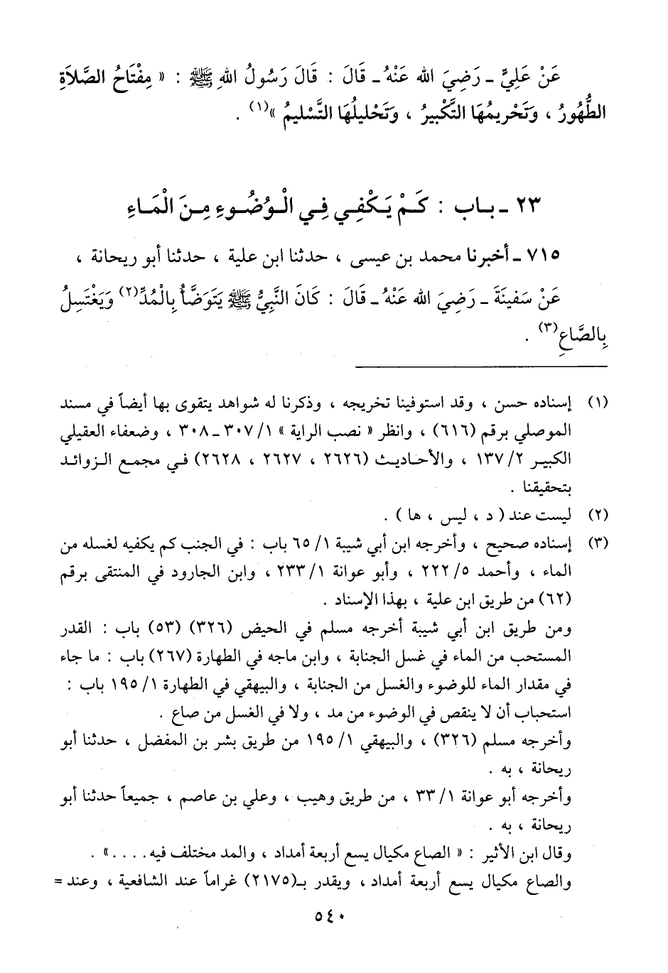 715 - أَخْبَرَنَا مُحَمَّدُ بْنُ عِيسَى، حَدَّثَنَا ابْنُ عُلَيَّةَ، حَدَّثَنَا أَبُو رَيْحَانَةَ، عَنْ سَفِينَةَ رَضِيَ اللَّهُ عَنْهُ، قَالَ: كَانَ النَّبِيُّ صَلَّى اللهُ عَلَيْهِ وَسَلَّمَ «§يَتَوَضَّأُ بِالْمُدِّ، وَيَغْتَسِلُ بِالصَّاعِ» Qإسناده صحيح