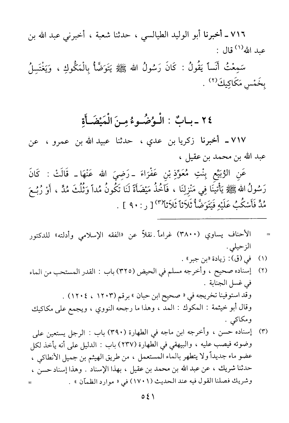 717 - أَخْبَرَنَا زَكَرِيَّا بْنُ عَدِيٍّ، حَدَّثَنَا عُبَيْدُ اللَّهِ بْنُ عَمْرٍو عَنْ عَبْدِ اللَّهِ بْنِ مُحَمَّدِ بْنِ عَقِيلٍ، عَنِ الرُّبَيِّعِ بِنْتِ مُعَوِّذِ بْنِ عَفْرَاءَ رَضِيَ اللَّهُ عَنْهَا، قَالَتْ: كَانَ رَسُولُ اللَّهِ صَلَّى اللهُ عَلَيْهِ وَسَلَّمَ يَأْتِينَا فِي مَنْزِلِنَا، «§فَآخُذُ مِيضَأَةً لَنَا تَكُونُ مُدًّا، وَثُلُثَ مُدٍّ، أَوْ رُبُعَ مُدٍّ، فَأَسْكُبُ عَلَيْهِ، فَيَتَوَضَّأُ ثَلَاثًا ثَلَاثًا» Qإسناده حسن