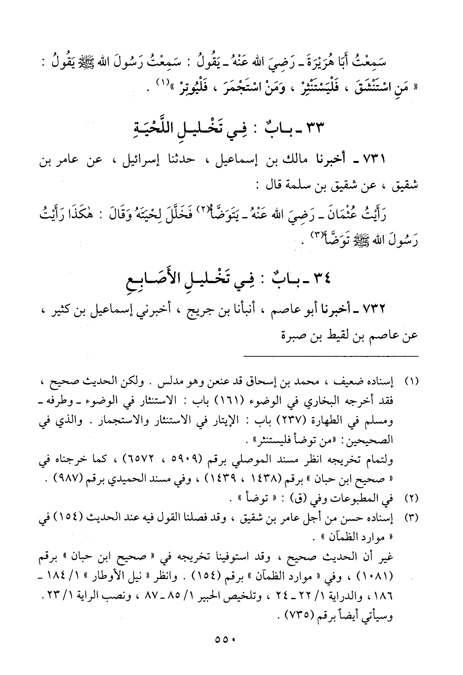 731 - أَخْبَرَنَا مَالِكُ بْنُ إِسْمَاعِيلَ، حَدَّثَنَا إِسْرَائِيلُ، عَنْ عَامِرِ بْنِ شَقِيقٍ، عَنْ شَقِيقِ بْنِ سَلَمَةَ، قَالَ: رَأَيْتُ عُثْمَانَ رَضِيَ اللَّهُ عَنْهُ، " §يَتَوَضَّأُ فَخَلَّلَ لِحْيَتَهُ، وَقَالَ: هَكَذَا رَأَيْتُ رَسُولَ اللَّهِ صَلَّى اللهُ عَلَيْهِ وَسَلَّمَ تَوَضَّأَ "Qإسناده حسن