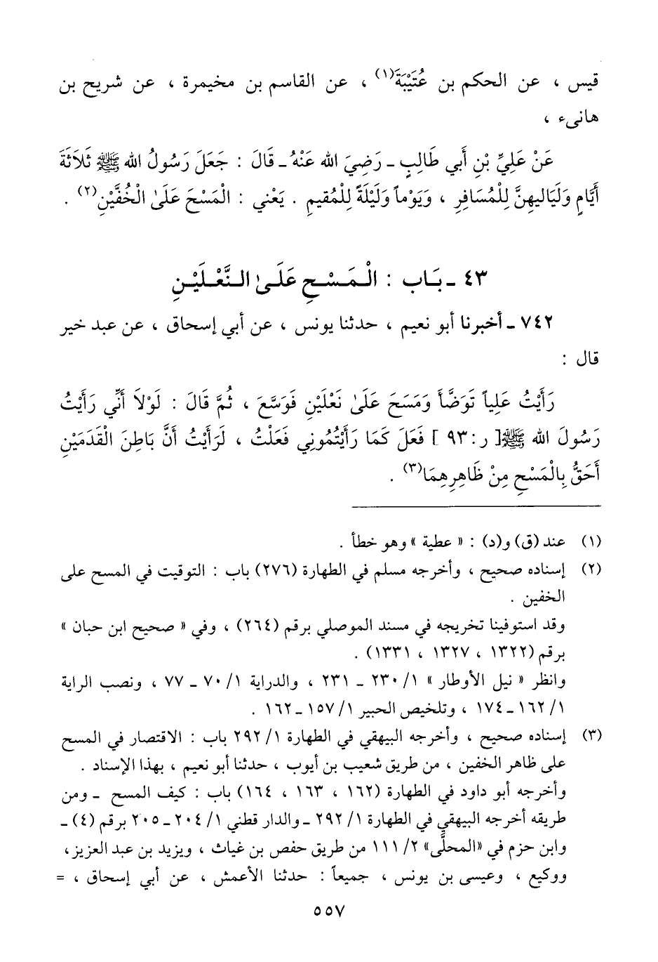 742 - أَخْبَرَنَا أَبُو نُعَيْمٍ، حَدَّثَنَا يُونُسُ، عَنْ أَبِي إِسْحَاقَ، عَنْ عَبْدِ خَيْرٍ، قَالَ: رَأَيْتُ عَلِيًّا §تَوَضَّأَ وَمَسَحَ عَلَى النَّعْلَيْنِ فَوَسَّعَ، ثُمَّ قَالَ: «لَوْلَا أَنِّي رَأَيْتُ رَسُولَ اللَّهِ صَلَّى اللهُ عَلَيْهِ وَسَلَّمَ فَعَلَ كَمَا رَأَيْتُمُونِي فَعَلْتُ، لَرَأَيْتُ أَنَّ بَاطِنَ الْقَدَمَيْنِ أَحَقُّ بِالْمَسْحِ مِنْ ظَاهِرِهِمَا» -[558]- قَالَ أَبُو مُحَمَّدٍ: «هَذَا الْحَدِيثُ مَنْسُوخٌ بِقَوْلِهِ تَعَالَى {وَامْسَحُوا بِرُءُوسِكُمْ وَأَرْجُلَكُمْ إِلَى الْكَعْبَيْنِ}» Qإسناده صحيح