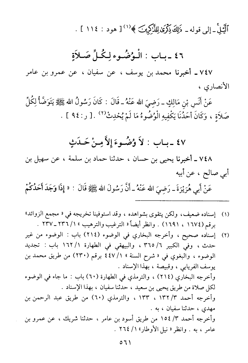747 - أَخْبَرَنَا مُحَمَّدُ بْنُ يُوسُفَ، عَنْ سُفْيَانَ، عَنْ عَمْرِو بْنِ عَامِرٍ الْأَنْصَارِيِّ، عَنْ أَنَسِ بْنِ مَالِكٍ رَضِيَ اللَّهُ عَنْهُ، قَالَ: كَانَ رَسُولُ اللَّهِ صَلَّى اللهُ عَلَيْهِ وَسَلَّمَ «§يَتَوَضَّأُ لِكُلِّ صَلَاةٍ، وَكَانَ أَحَدُنَا يَكْفِيهِ الْوُضُوءُ مَا لَمْ يُحْدِثْ» Qإسناده صحيح