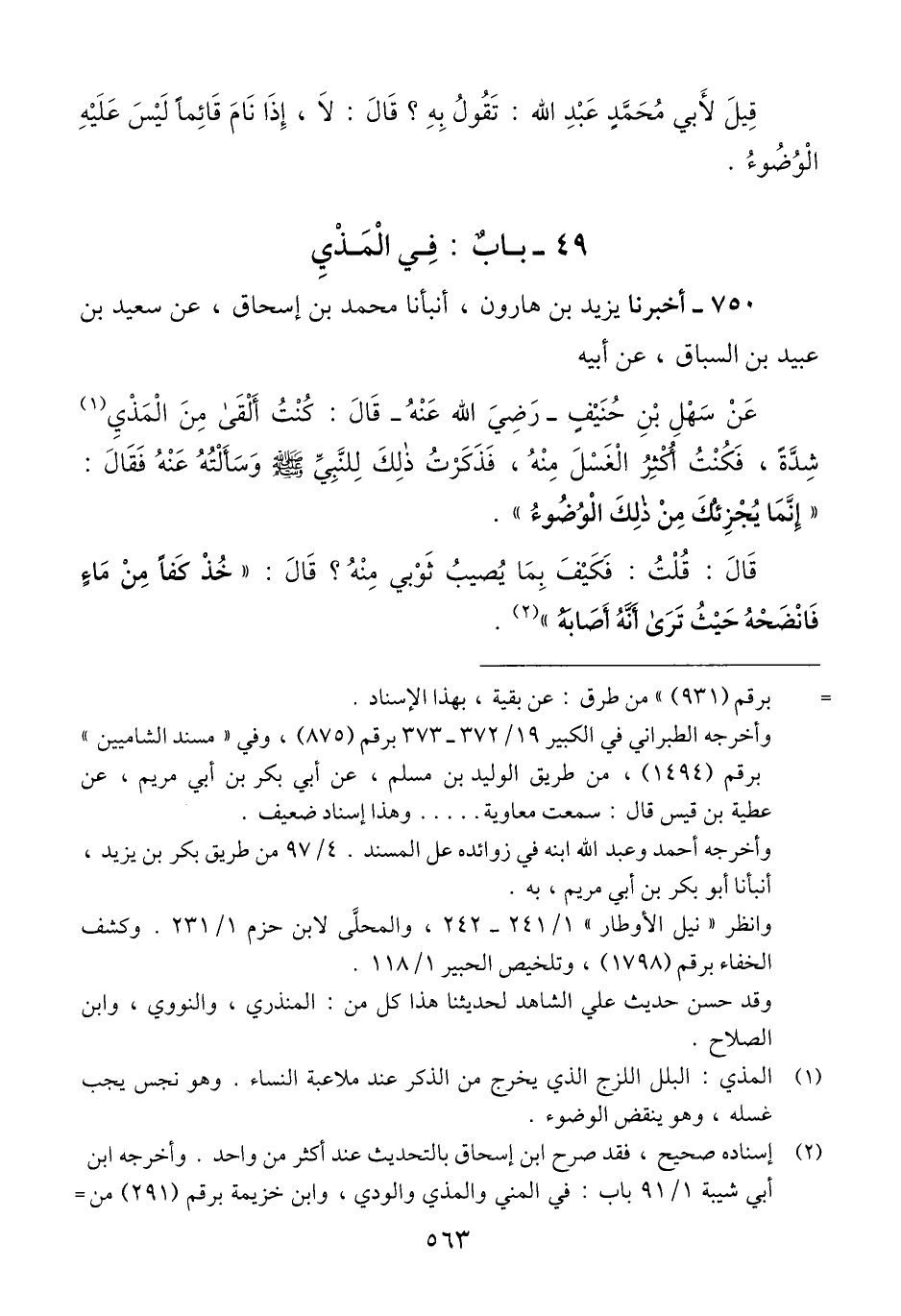 750 - أَخْبَرَنَا يَزِيدُ بْنُ هَارُونَ، أَنبَأَنَا مُحَمَّدُ بْنُ إِسْحَاقَ، عَنْ سَعِيدِ بْنِ عُبَيْدِ بْنِ السَّبَّاقِ، عَنْ أَبِيهِ، عَنْ سَهْلِ بْنِ حُنَيْفٍ رَضِيَ اللَّهُ عَنْهُ، قَالَ: كُنْتُ أَلْقَى مِنَ الْمَذْيِ شِدَّةً، فَكُنْتُ أُكْثِرُ الْغُسْلَ مِنْهُ، فَذَكَرْتُ ذَلِكَ لِلنَّبِيِّ صَلَّى اللهُ عَلَيْهِ وَسَلَّمَ وَسَأَلْتُهُ عنْهُ فَقَالَ: «§إِنَّمَا يُجْزِئُكَ مِنْ ذَلِكَ الْوُضُوءُ» قَالَ: قُلْتُ: فَكَيْفَ بِمَا يُصِيبُ ثَوْبِي مِنْهُ؟ قَالَ: «خُذْ كَفًّا مِنْ مَاءٍ فَانْضَحْهُ حَيْثُ تَرَى أَنَّهُ أَصَابَهُ» Qإسناده صحيح