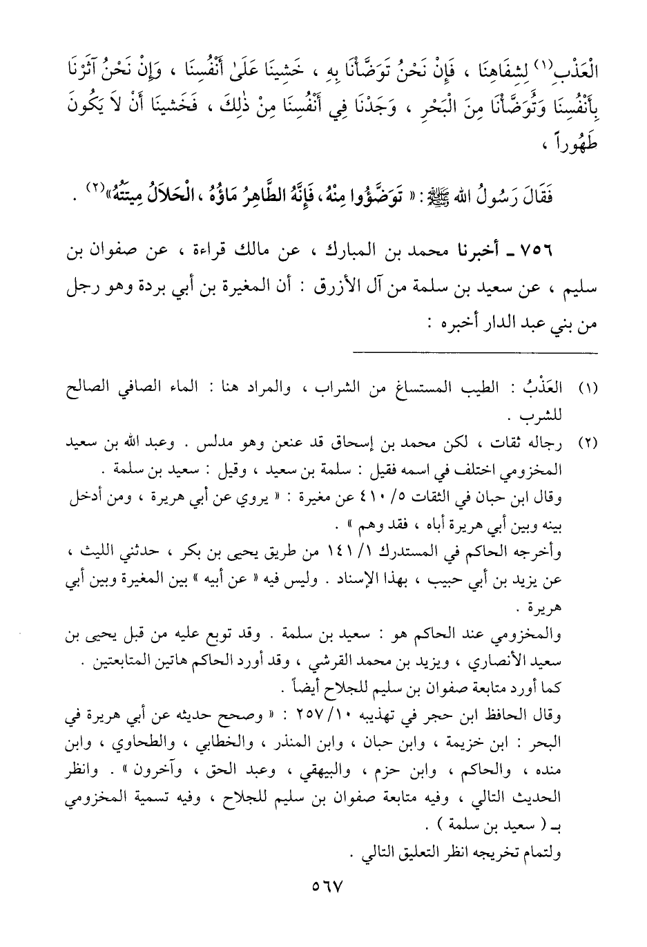 756 - أَخْبَرَنَا مُحَمَّدُ بْنُ الْمُبَارَكِ، عَنْ مَالِكٍ، قِرَاءَةً عَنْ صَفْوَانَ بْنِ سُلَيْمٍ، عَنْ سَعِيدِ بْنِ سَلَمَةَ، مِنْ آلِ الْأَزْرَقِ أَنَّ الْمُغِيرَةَ بْنَ أَبِي بُرْدَةَ، وَهُوَ رَجُلٌ مِنْ بَنِي عَبْدِ الدَّارِ أَخْبَرَهُ: -[568]- أَنَّهُ سَمِعَ أَبَا هُرَيْرَةَ رَضِيَ اللَّهُ عَنْهُ، يَقُولُ: سَأَلَ رَجُلٌ رَسُولَ اللَّهِ صَلَّى اللهُ عَلَيْهِ وَسَلَّمَ فَقَالَ: إِنَّا نَرْكَبُ الْبَحْرَ وَمَعَنَا الْقَلِيلُ مِنَ الْمَاءِ. فَإِنْ تَوَضَّأْنَا بِهِ عَطِشْنَا، أَفَنَتَوَضَّأُ مِنْ مَاءِ الْبَحْرِ؟ فَقَالَ رَسُولُ اللَّهِ صَلَّى اللهُ عَلَيْهِ وَسَلَّمَ: «§هُوَ الطَّهُورُ مَاؤُهُ، الْحِلُّ مَيْتَتُهُ» Qإسناده صحيح