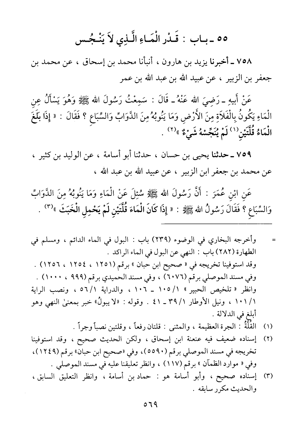 759 - حَدَّثَنَا يَحْيَى بْنُ حَسَّانَ، حَدَّثَنَا أَبُو أُسَامَةَ، عَنِ الْوَلِيدِ بْنِ كَثِيرٍ، عَنْ مُحَمَّدِ بْنِ جَعْفَرِ بْنِ الزُّبَيْرِ، عَنْ عُبَيْدِ اللَّهِ بْنِ عَبْدِ اللَّهِ، عَنِ ابْنِ عُمَرَ، أَنَّ رَسُولَ اللَّهِ صَلَّى اللهُ عَلَيْهِ وَسَلَّمَ سُئِلَ عَنِ الْمَاءِ وَمَا يَنُوبُهُ مِنَ الدَّوَابِّ وَالسِّبَاعِ؟ فَقَالَ رَسُولُ اللَّهِ صَلَّى اللهُ عَلَيْهِ وَسَلَّمَ: «§إِذَا كَانَ الْمَاءُ قُلَّتَيْنِ لَمْ يَحْمِلِ الْخَبَثَ» Qإسناده صحيح