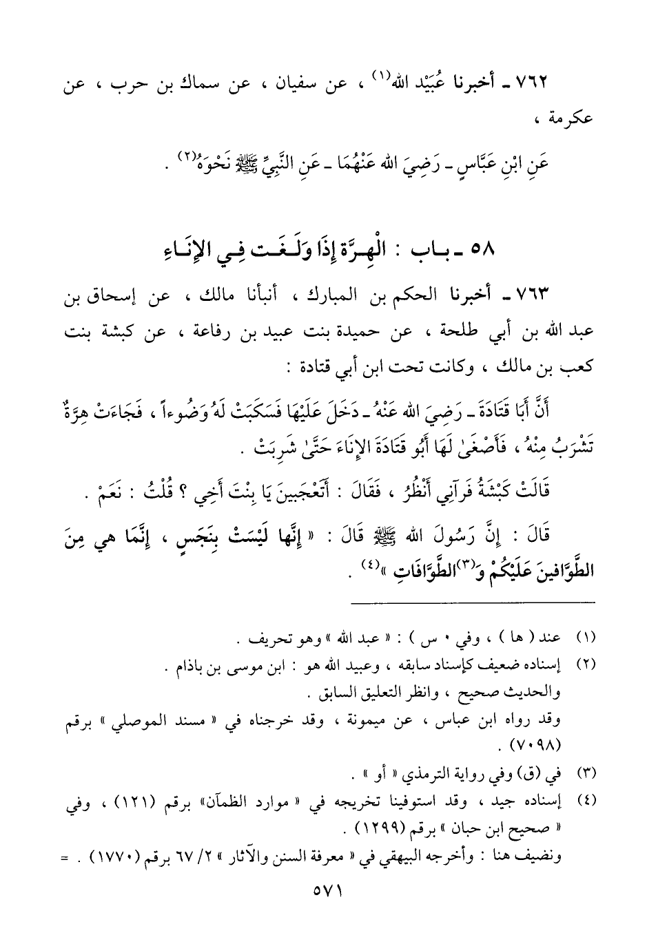 763 - أَخْبَرَنَا الْحَكَمُ بْنُ الْمُبَارَكِ، أَنبَأَنَا مَالِكٌ، عَنْ إِسْحَاقَ بْنِ عَبْدِ اللَّهِ بْنِ أَبِي طَلْحَةَ، عَنْ حُمَيْدَةَ بِنْتِ عُبَيْدِ بْنِ رِفَاعَةَ، عَنْ كَبْشَةَ بِنْتِ كَعْبِ بْنِ مَالِكٍ، وَكَانَتْ تَحْتَ ابْنِ أَبِي قَتَادَةَ، أَنَّ أَبَا قَتَادَةَ رَضِيَ اللَّهُ عَنْهُ، دَخَلَ عَلَيْهَا فَسَكَبَتْ لَهُ وَضُوءًا، فَجَاءَتْ هِرَّةٌ تَشْرَبُ مِنْهُ، فَأَصْغَى لَهَا أَبُو قَتَادَةَ الْإِنَاءَ حَتَّى شَرِبَتْ. قَالَتْ كَبْشَةُ فَرَآنِي أَنْظُرُ، فَقَالَ: أَتَعْجَبِينَ يَا بِنْتَ أَخِي؟ قُلْتُ: نَعَمْ. قَالَ: إِنَّ رَسُولَ اللَّهِ صَلَّى اللهُ عَلَيْهِ وَسَلَّمَ قَالَ: «§إِنَّهَا لَيْسَتْ بِنَجَسٍ، إِنَّمَا هِيَ مِنَ الطَّوَّافِينَ عَلَيْكُمْ وَالطَّوَّافَاتِ» Qإسناده جيد