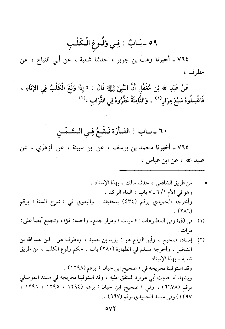 764 - أَخْبَرَنَا وَهْبُ بْنُ جَرِيرٍ، حَدَّثَنَا شُعْبَةُ، عَنْ أَبِي التَّيَّاحِ، عَنْ مُطَرِّفٍ، عَنْ عَبْدِ اللَّهِ بْنِ مُغَفَّلٍ أَنَّ النَّبِيَّ صَلَّى اللهُ عَلَيْهِ وَسَلَّمَ قَالَ: «§إِذَا وَلَغَ الْكَلْبُ فِي الْإِنَاءِ، فَاغْسِلُوهُ سَبْعَ مِرَارٍ، وَالثَّامِنَةَ عَفِّرُوهُ فِي التُّرَابِ» Qإسناده صحيح