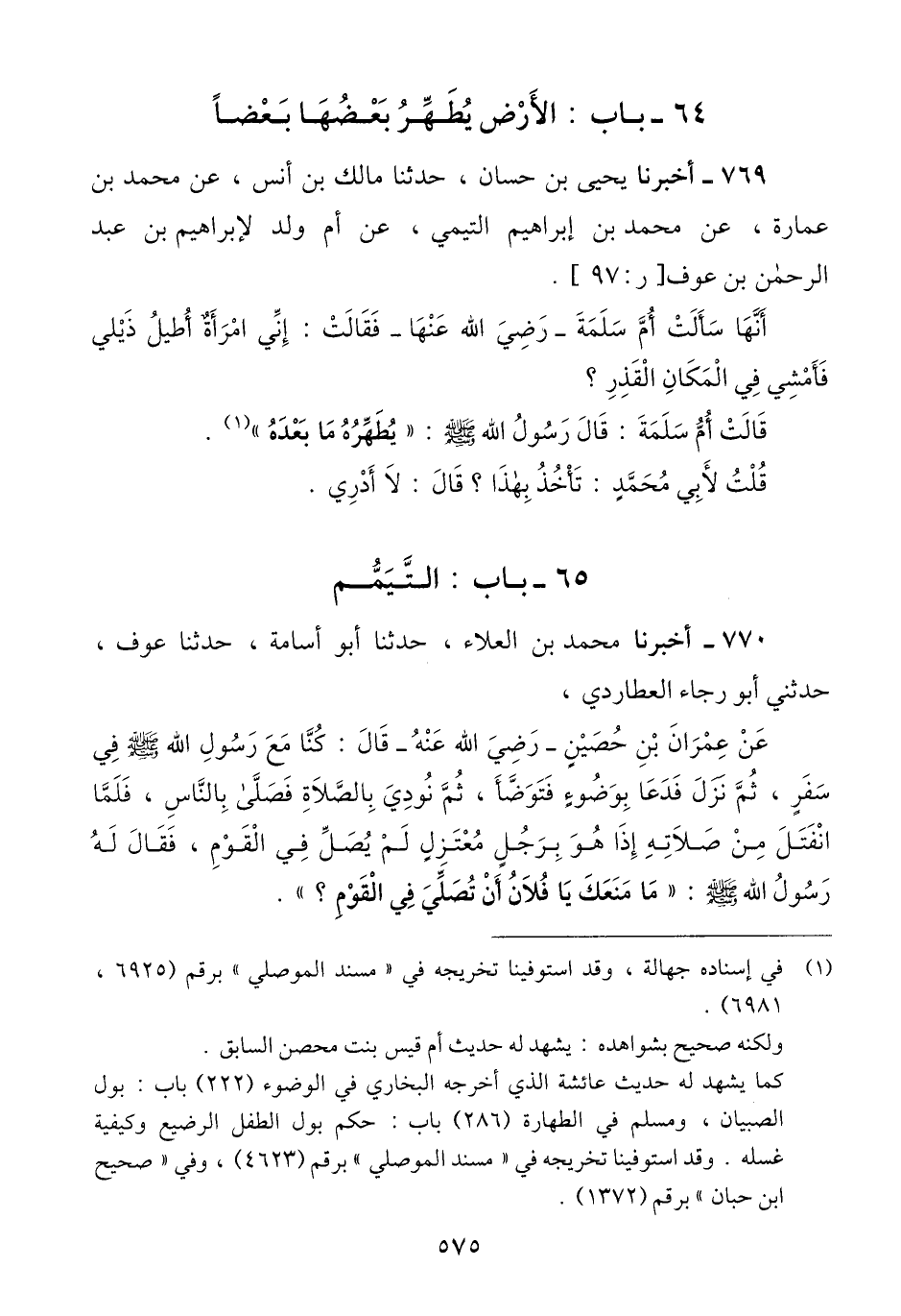 769 - أَخْبَرَنَا يَحْيَى بْنُ حَسَّانَ، حَدَّثَنَا مَالِكُ بْنُ أَنَسٍ، عَنْ مُحَمَّدِ بْنِ عُمَارَةَ، عَنْ مُحَمَّدِ بْنِ إِبْرَاهِيمَ التَّيْمِيِّ، عَنْ أُمِّ وَلَدٍ لِإِبْرَاهِيمَ بْنِ عَبْدِ الرَّحْمَنِ بْنِ عَوْفٍ، أَنَّهَا سَأَلَتْ أُمَّ سَلَمَةَ رَضِيَ اللَّهُ عَنْهَا، فَقَالَتْ: إِنِّي امْرَأَةٌ أُطِيلُ ذَيْلِي فَأَمْشِي فِي الْمَكَانِ الْقَذِرِ؟ قَالَتْ أُمَّ سَلَمَةَ: قَالَ رَسُولُ اللَّهِ صَلَّى اللهُ عَلَيْهِ وَسَلَّمَ: «§يُطَهِّرُهُ مَا بَعْدَهُ» قُلْتُ لِأَبِي مُحَمَّدٍ: تَأْخُذُ بِهَذَا؟ قَالَ: لَا أَدْرِيQفي إسناده جهالة ولكنه صحيح بشواهده