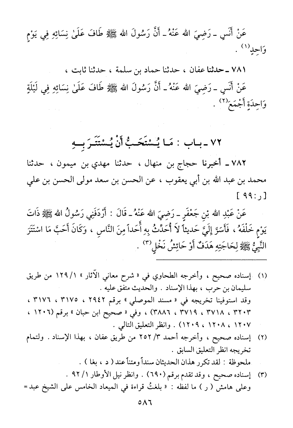 782 - أَخْبَرَنَا حَجَّاجُ بْنُ مِنْهَالٍ، حَدَّثَنَا مَهْدِيُّ بْنُ مَيْمُونٍ، حَدَّثَنَا مُحَمَّدُ بْنُ عَبْدِ اللَّهِ بْنِ أَبِي يَعْقُوبَ، عَنِ الْحَسَنِ بْنِ سَعْدٍ، مَوْلَى الْحَسَنِ بْنِ عَلِيٍّ، عَنْ عَبْدِ اللَّهِ بْنِ جَعْفَرٍ رَضِيَ اللَّهُ عَنْهُ، قَالَ: أَرْدَفَنِي رَسُولُ اللَّهِ صَلَّى اللهُ عَلَيْهِ وَسَلَّمَ ذَاتَ يَوْمٍ خَلْفَهُ فَأَسَرَّ إِلَيَّ حَدِيثًا لَا أُحَدِّثُ بِهِ أَحَدًا مِنَ النَّاسِ وَكَانَ «§أَحَبَّ مَا اسْتَتَرَ النَّبِيُّ صَلَّى اللهُ عَلَيْهِ وَسَلَّمَ لِحَاجَتِهِ هَدَفٌ أَوْ حَائِشُ نَخْلٍ» Qإسناده صحيح