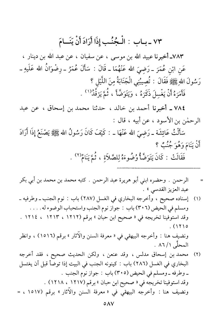 784 - أَخْبَرَنَا أَحْمَدُ بْنُ خَالِدٍ، حَدَّثَنَا مُحَمَّدُ بْنُ إِسْحَاقَ، عَنْ عَبْدِ الرَّحْمَنِ بْنِ الْأَسْوَدِ، عَنْ أَبِيهِ، قَالَ: سَأَلْتُ عَائِشَةَ رَضِيَ اللَّهُ عَنْهَا، كَيْفَ كَانَ رَسُولُ اللَّهِ صَلَّى اللهُ عَلَيْهِ وَسَلَّمَ يَصْنَعُ إِذَا أَرَادَ أَنْ يَنَامَ وَهُوَ جُنُبٌ؟ فَقَالَتْ: كَانَ «§يَتَوَضَّأُ وُضُوءَهُ لِلصَّلَاةِ، ثُمَّ يَنَامُ» Qمحمد بن إسحاق مدلس وقد عنعن ولكن الحديث صحيح