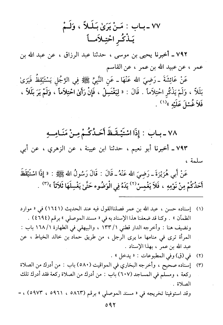 792 - أَخْبَرَنَا يَحْيَى بْنُ مُوسَى، حَدَّثَنَا عَبْدُ الرَّزَّاقِ، عَنْ عَبْدِ اللَّهِ بْنِ عُمَرَ، عَنْ عُبَيْدِ اللَّهِ بْنِ عُمَرَ، عَنِ الْقَاسِمِ، عَنْ عَائِشَةَ رَضِيَ اللَّهُ عَنْهَا، عَنِ النَّبِيِّ صَلَّى اللهُ عَلَيْهِ وَسَلَّمَ فِي الرَّجُلِ يَسْتَيْقِظُ فَيَرَى بَلَلًا، وَلَمْ يَذْكُرِ احْتِلَامًا. قَالَ: «§لِيَغْتَسِلْ، فَإِنْ رَأَى احْتِلَامًا، وَلَمْ يَرَ بَلَلًا، فَلَا غُسْلَ عَلَيْهِ» Qإسناده حسن