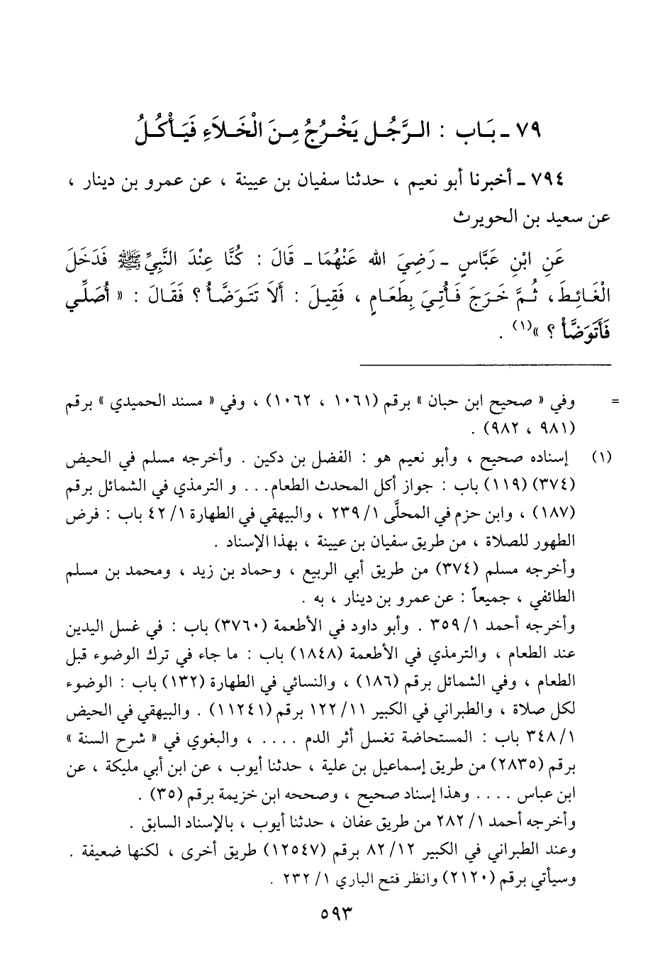 794 - أَخْبَرَنَا أَبُو نُعَيْمٍ، حَدَّثَنَا سُفْيَانُ بْنُ عُيَيْنَةَ، عَنْ عَمْرِو بْنِ دِينَارٍ، عَنْ سَعِيدِ بْنِ الْحُوَيْرِثِ، عَنِ ابْنِ عَبَّاسٍ رَضِيَ اللَّهُ عَنْهُمَا، قَالَ: كُنَّا عِنْدَ النَّبِيِّ صَلَّى اللهُ عَلَيْهِ وَسَلَّمَ فَدَخَلَ الْغَائِطَ، ثُمَّ خَرَجَ فَأُتِيَ بِطَعَامٍ، فَقِيلَ: أَلَا تَتَوَضَّأُ؟ فَقَالَ: «§أُصَلِّي فَأَتَوَضَّأُ؟» Qإسناده صحيح