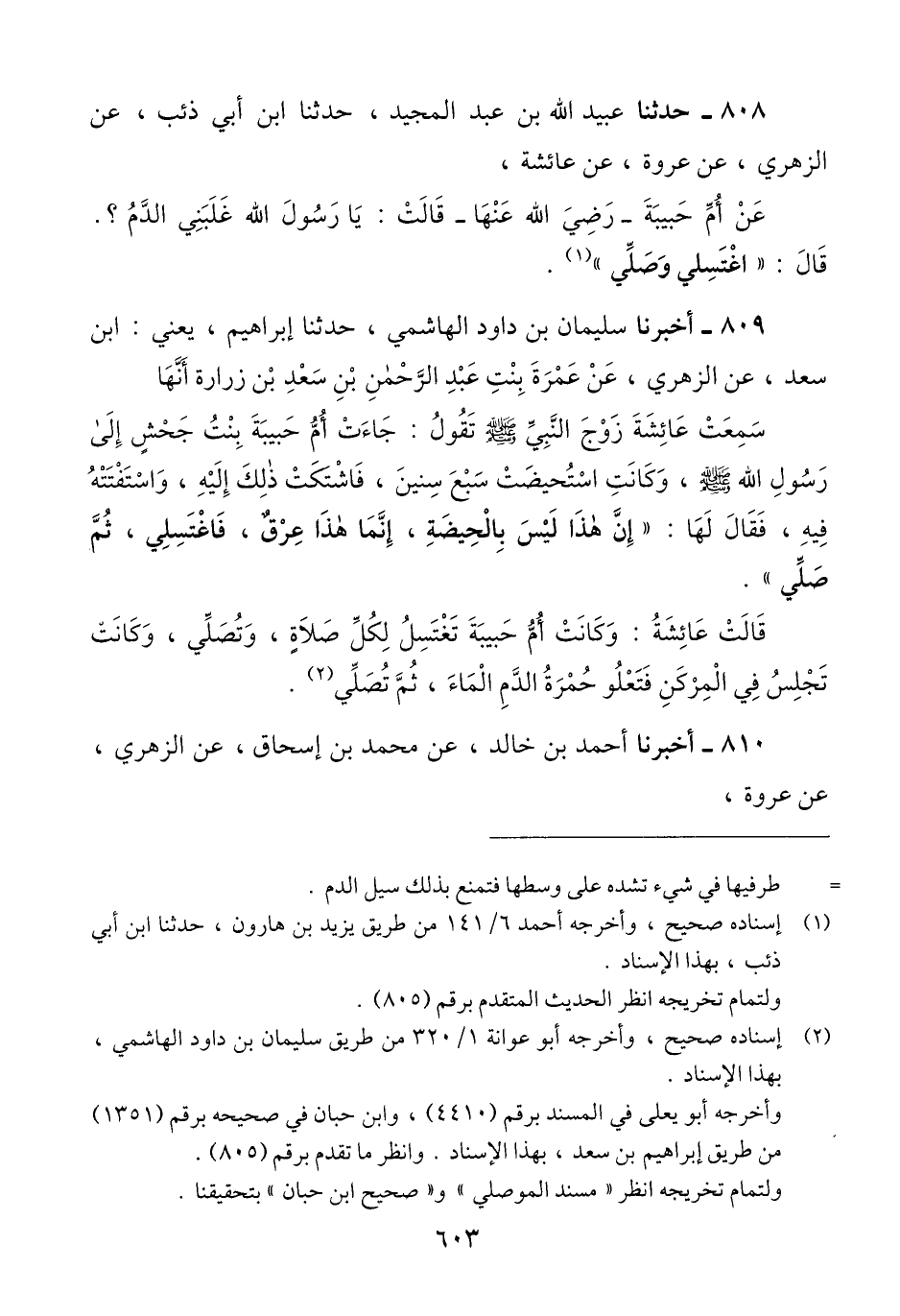 808 - حَدَّثَنَا عُبَيْدُ اللَّهِ بْنُ عَبْدِ الْمَجِيدِ، حَدَّثَنَا ابْنُ أَبِي ذِئْبٍ، عَنِ الزُّهْرِيِّ، عَنْ عُرْوَةَ، عَنْ عَائِشَةَ، عَنْ أُمِّ حَبِيبَةَ رَضِيَ اللَّهُ عَنْهَا، قَالَتْ: يَا رَسُولَ اللَّهِ غَلَبَنِي الدَّمُ؟ قَالَ: «§اغْتَسِلِي وَصَلِّي» Qإسناده صحيح