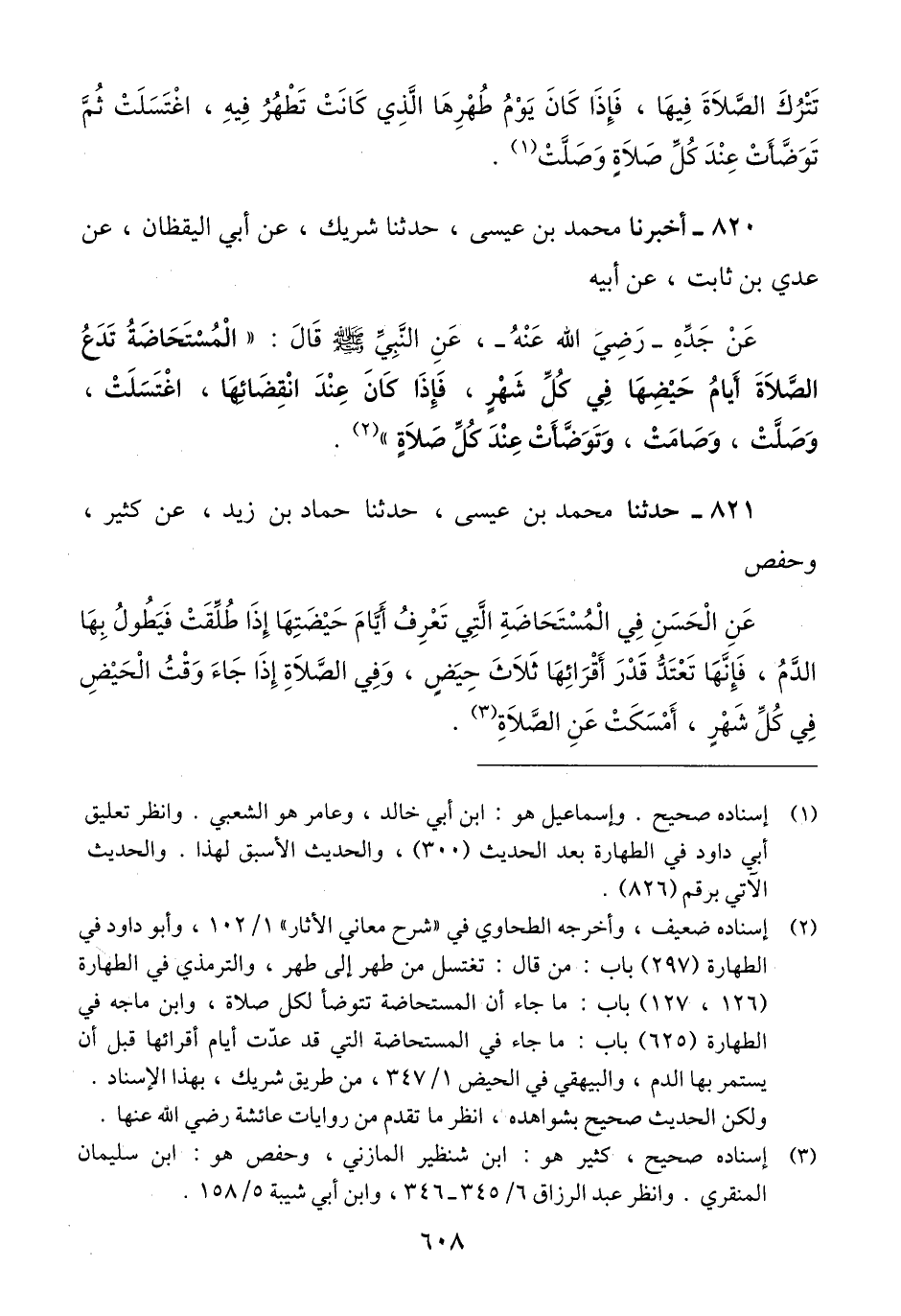 821 - حَدَّثَنَا مُحَمَّدُ بْنُ عِيسَى، حَدَّثَنَا حَمَّادُ بْنُ زَيْدٍ، عَنْ كَثِيرٍ، وَحَفْصٍ، عَنِ الْحَسَنِ «فِي §الْمُسْتَحَاضَةِ الَّتِي تَعْرِفُ أَيَّامَ حَيْضَتِهَا إِذَا طُلِّقَتْ فَيَطُولُ بِهَا الدَّمُ، فَإِنَّهَا تَعْتَدُّ قَدْرَ أَقْرَائِهَا ثَلَاثَ حِيَضٍ، وَفِي الصَّلَاةِ إِذَا جَاءَ وَقْتُ الْحَيْضِ فِي كُلِّ شَهْرٍ، أَمْسَكَتْ عَنِ الصَّلَاةِ» Qإسناده صحيح