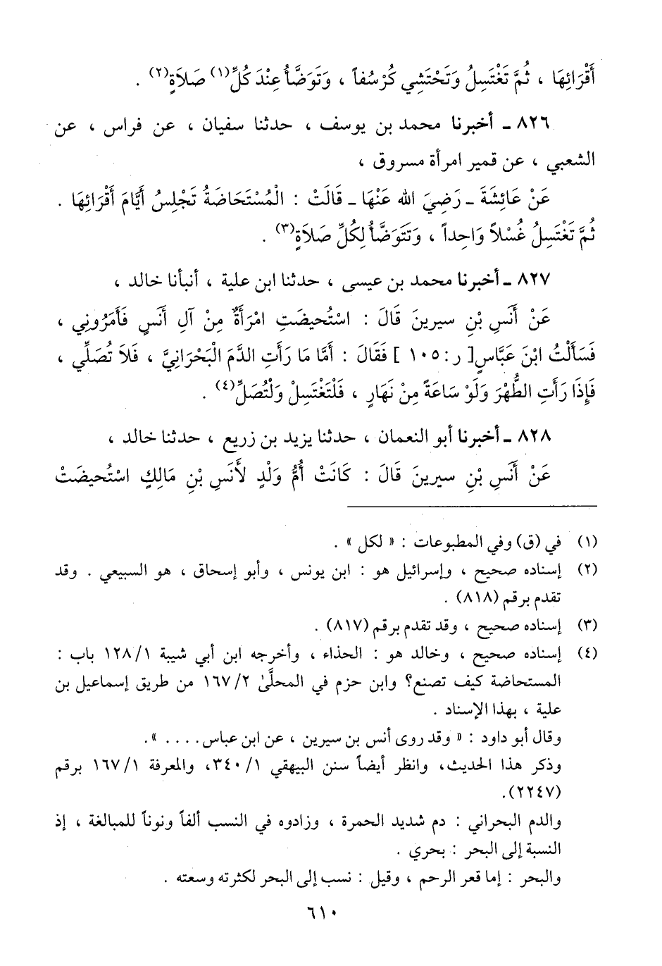 827 - أَخْبَرَنَا مُحَمَّدُ بْنُ عِيسَى، حَدَّثَنَا ابْنُ عُلَيَّةَ، أَنبَأَنَا خَالِدٌ، عَنْ أَنَسِ بْنِ سِيرِينَ، قَالَ: اسْتُحِيضَتْ امْرَأَةٌ مِنْ آلِ أَنَسٍ فَأَمَرُونِي، فَسَأَلْتُ ابْنَ عَبَّاسٍ، فَقَالَ: «§أَمَّا مَا رَأَتِ الدَّمَ الْبَحْرَانِيَّ، فَلَا تُصَلِّي، فَإِذَا رَأَتِ الطُّهْرَ وَلَوْ سَاعَةً مِنْ نَهَارٍ، فَلْتَغْتَسِلْ وَلْتُصَلِّ» Qإسناده صحيح