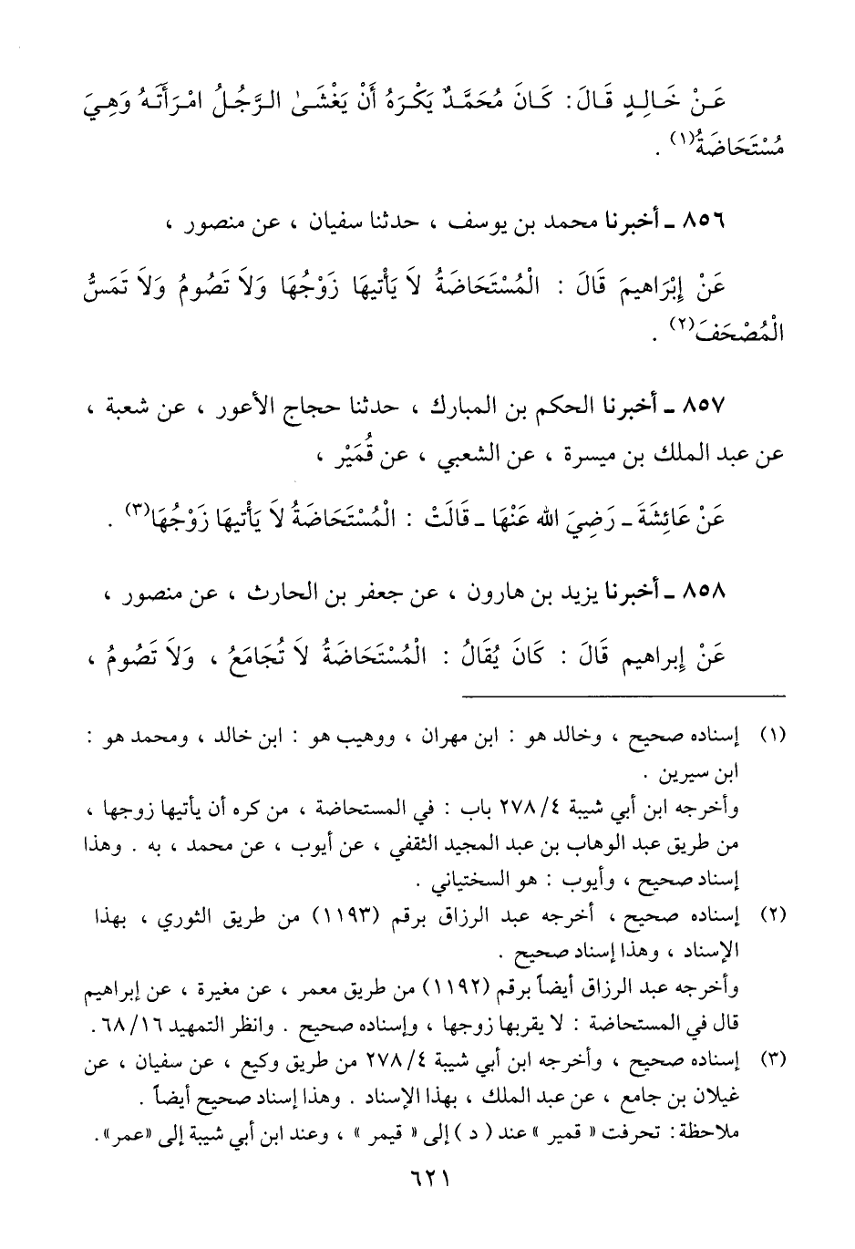 856 - أَخْبَرَنَا مُحَمَّدُ بْنُ يُوسُفَ، حَدَّثَنَا سُفْيَانُ، عَنْ مَنْصُورٍ، عَنْ إِبْرَاهِيمَ قَالَ: «§الْمُسْتَحَاضَةُ لَا يَأْتِيهَا زَوْجُهَا، وَلَا تَصُومُ، وَلَا تَمَسُّ الْمُصْحَفَ» Qإسناده صحيح