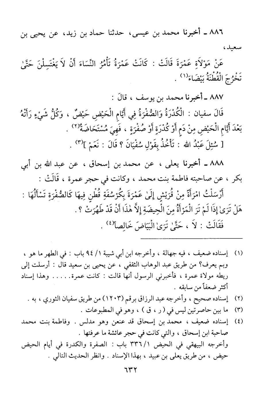 886 - أَخْبَرَنَا مُحَمَّدُ بْنُ عِيسَى، حَدَّثَنَا حَمَّادُ بْنُ زَيْدٍ، عَنْ يَحْيَى بْنِ سَعِيدٍ، عَنْ مَوْلَاةِ عَمْرَةَ، قَالَتْ: كَانَتْ عَمْرَةُ «§تَأْمُرُ النِّسَاءَ أَنْ لَا يَغْتَسِلْنَ حَتَّى تَخْرُجَ الْقُطْنَةُ بَيْضَاءَ» Qإسناده ضعيف فيه جهالة